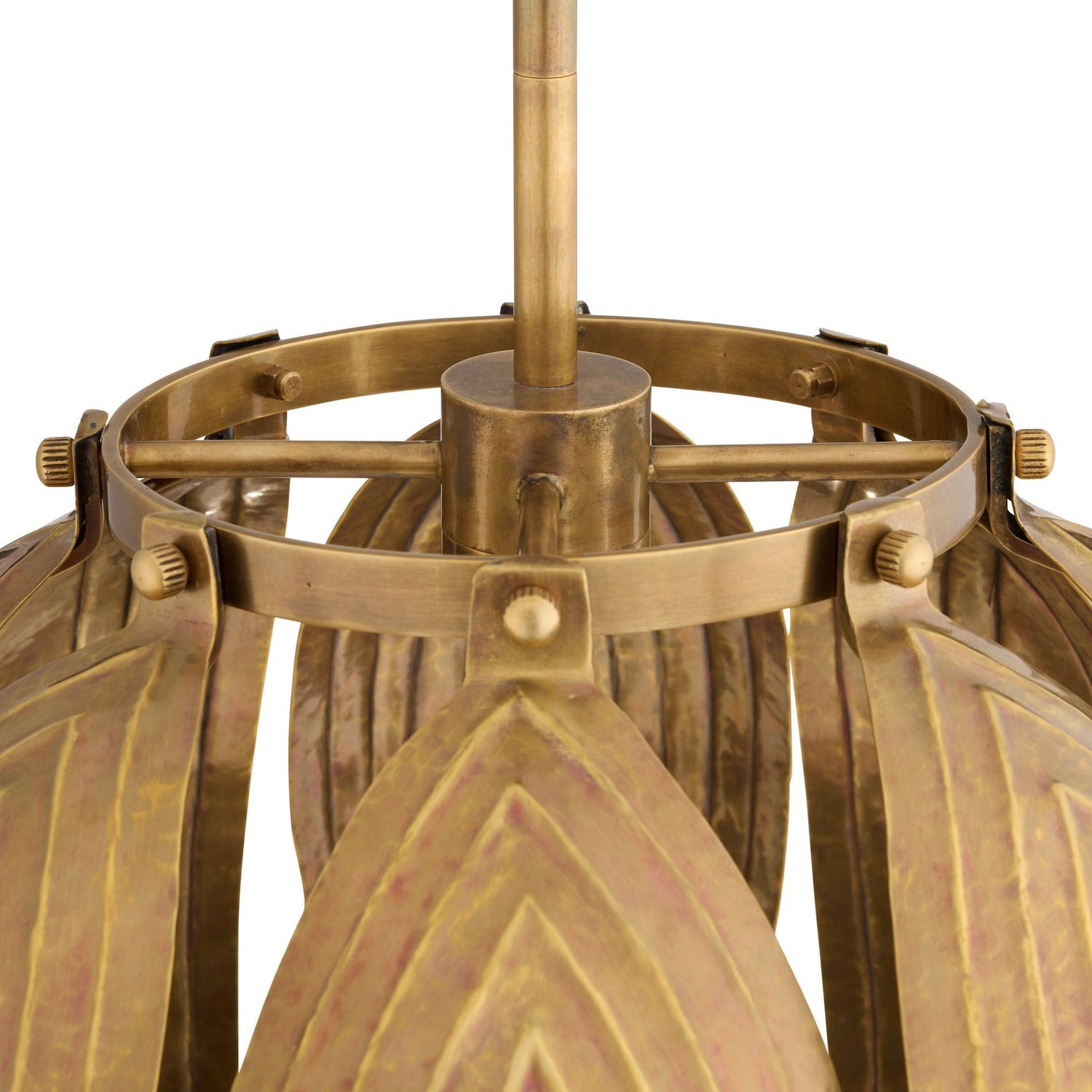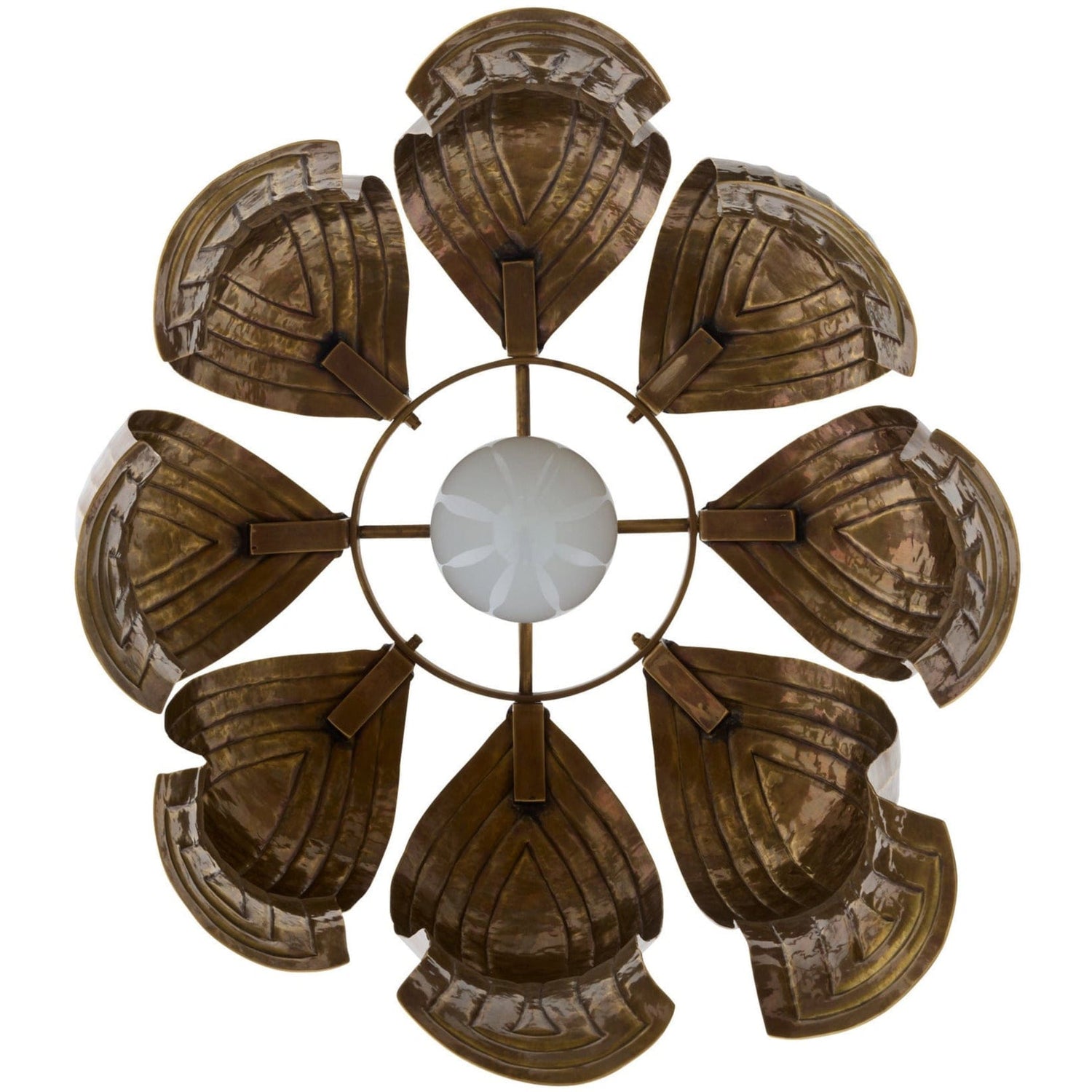 Our sculptural tulip shade of etched vintage brass offers a botanical beauty. Inspired by art deco, the layered petal shapes are both sculptural and refined. Damp-rated, although limited covered outdoor conditions may affect finish. Finish will vary.