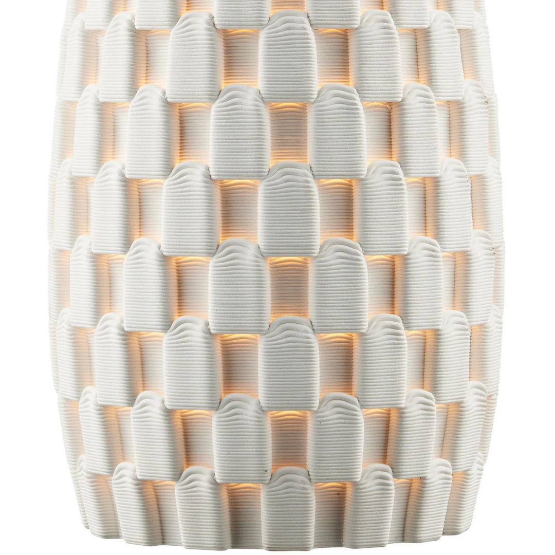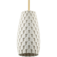 The Tessitura Pendant features a shade made of white 3D-printed porcelain with a precise grid pattern. Because the ceramic is opaque, small slits are cut into the bottom of the raised sections to direct light into the indented areas, creating a subtle play of shadow and glow. The process uses only the clay required, giving the design a built-in sustainability story. An extra-bright bulb enhances the effect, while a metal stem in a brass finish completes the pendant’s clean profile. This fixture is dimmable.