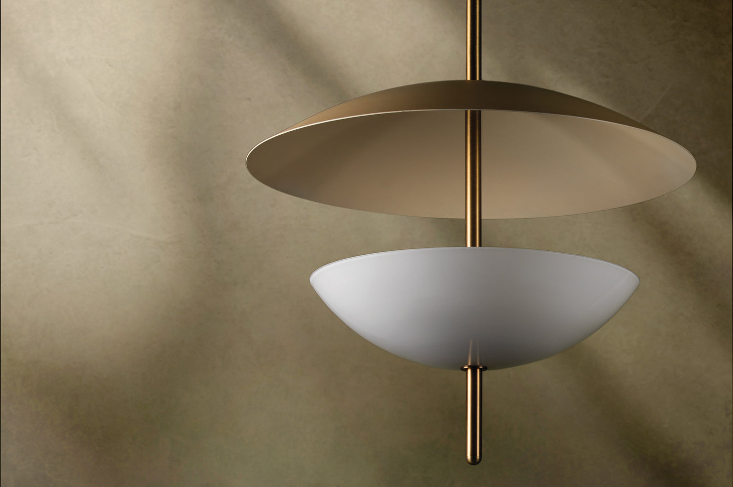 Dion captures modern organic design with its round, slender Patina Brass rod that pierces through a pair of domed shades in warm, neutral tones. The opal glossy glass shade below fills with a soft glow and casts an uplight that reflects off of the larger Soft Sand dish above. This pretty pendant defines subtle sophistication.