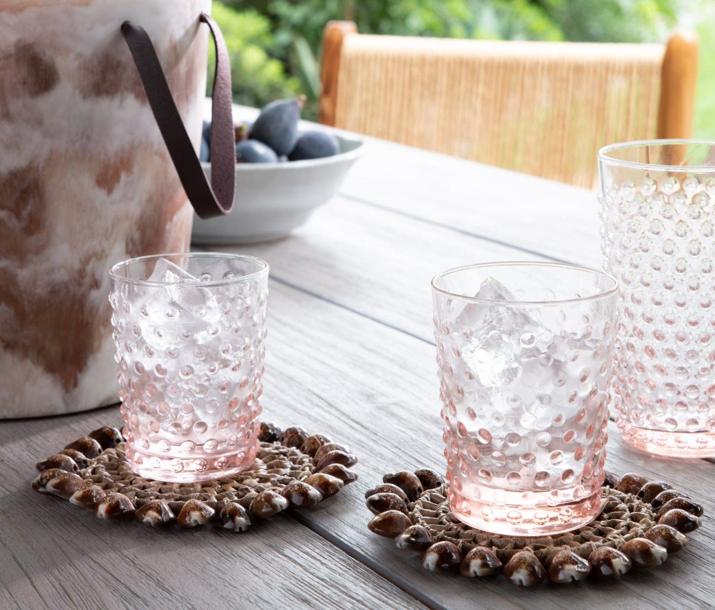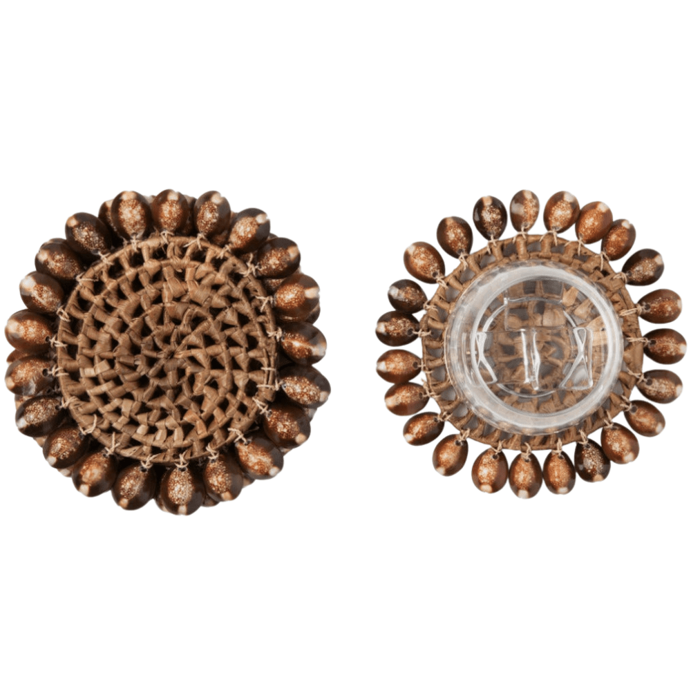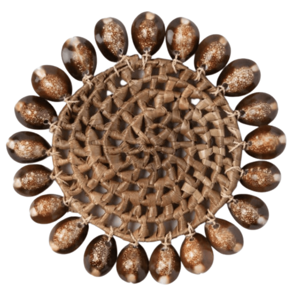 Natural cowrie is woven into the Brown pandan leaf of the Bondi coasters.