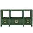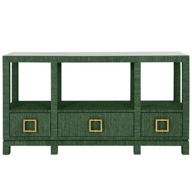 A striking blend of form and texture, the Campbell console is wrapped in richly dyed grasscloth, offering a tactile elegance that elevates any space. The design features an open shelf, three bottom drawers, and square satin brass hardware. This console is a standout piece for any space!