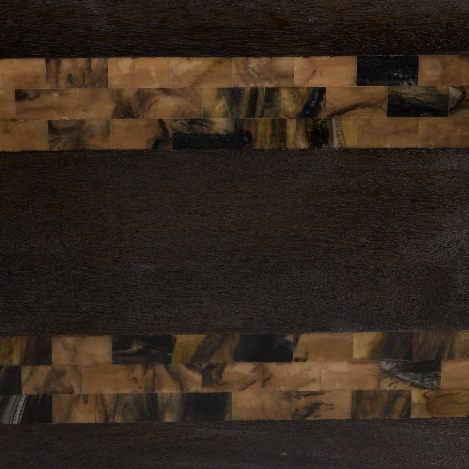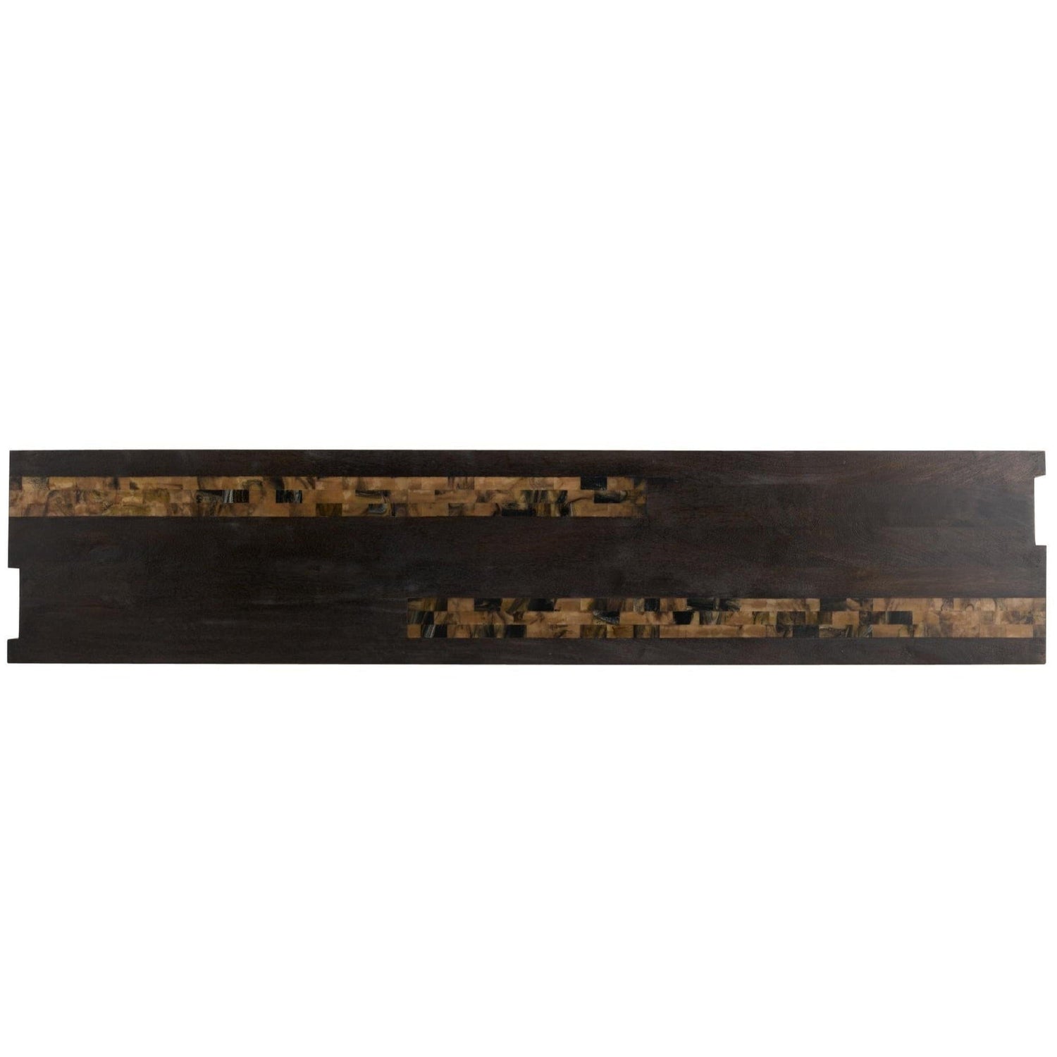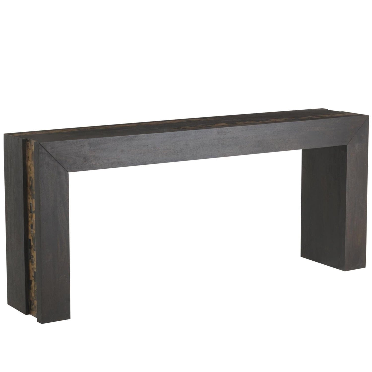 The thick waterfall silhouette of this umber mango wood table makes a chic statement in the entry or hallway. An inset of racing stripe of natural faux horn resin cascades from the narrow top down the sides, assuring a visual impact from every angle. Finish will vary.