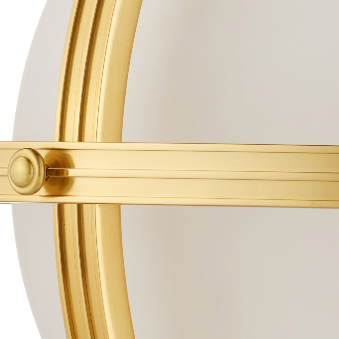 The Astral Pendant is crafted from aluminum in a luminous gold finish, its design inspired by celestial forms. A large opaque glass globe at the center houses a single bulb, while two brass bands orbit around it like Saturn’s rings. The encircling bands are adjustable, allowing easy access for changing the bulb, while adding sculptural dimension to the fixture. The fixture has one light and is dimmable.