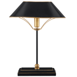 The Daphne Table Lamp looks as if it is made of one material in three distinctive finishes but the base is made of wood while the other elements on the ivory table lamp are made of wrought iron and brass in antique brass and gold finishes. The shape of the oval shade with its painted trim is a design detail worth noting.