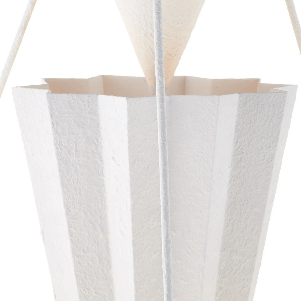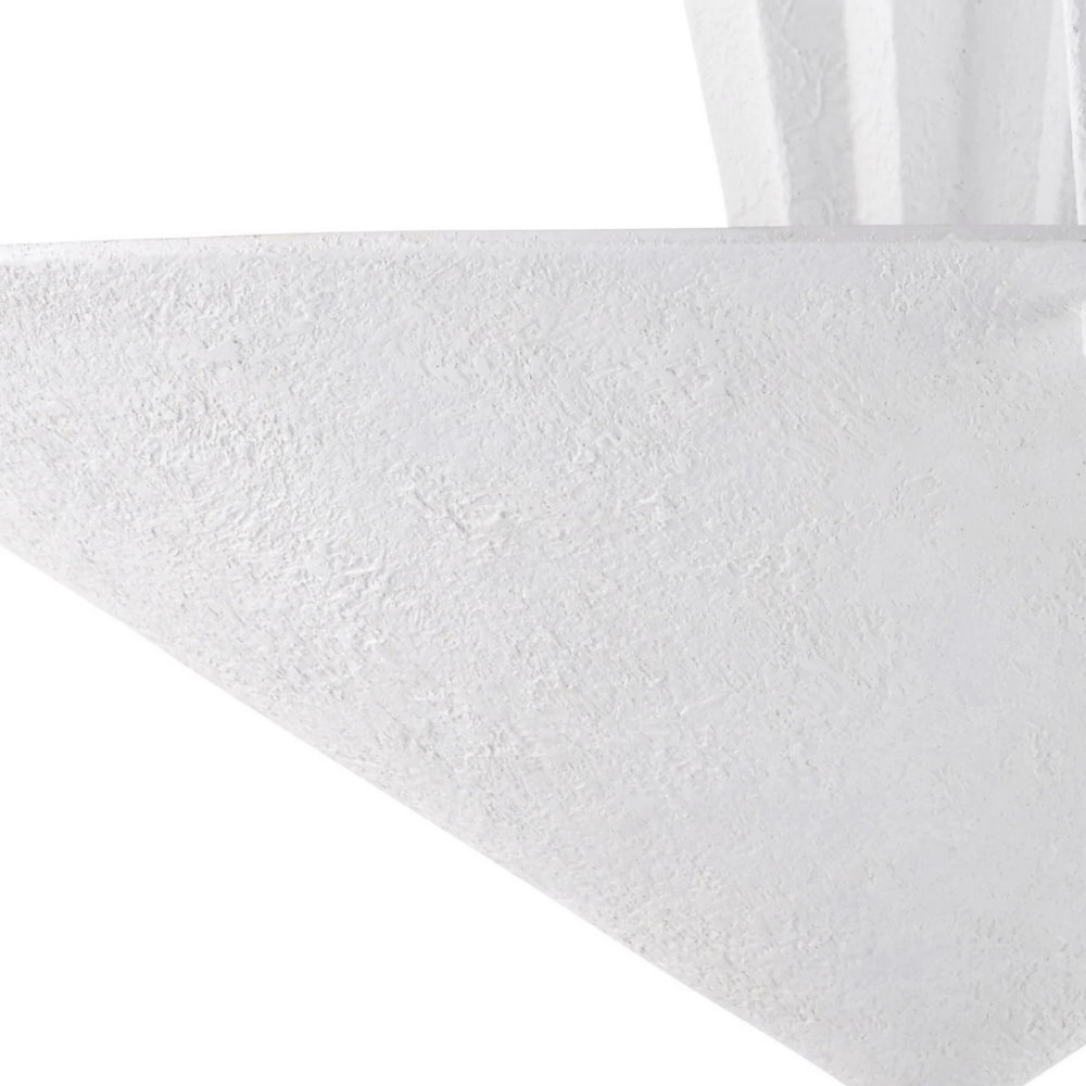 Playing with geometrical shapes that create tiers of up-light, the Empyrean Chandelier was designed with clean lines, making it as contemporary as designs come. The fluted shape of the middle shade is a design detail that brings added interest to the profile of this white chandelier. The wrought iron fixture is covered in a yeso blanco finish that creates a stippled effect to add a subtle tone-on-tone texture to the piece.