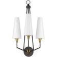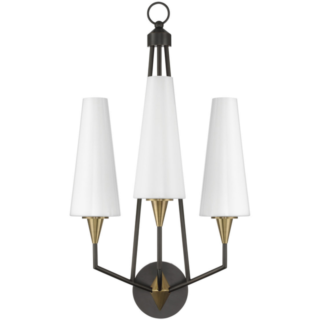 The Hennin Wall Sconce takes its cues from Mid-Century modern design with a striking angular frame in an oil-rubbed bronze finish. The metal structure is accented with a plumb-like detail and bobeches in antique brass, adding warmth and contrast to the darker frame. Each arm is topped with an elongated white glass shade fitted with integrated LED. Blending modern technology with a timeless silhouette, this chandelier balances crisp geometry with refined materials for a look that feels both classic and current. The three-light sconce is not dimmable.