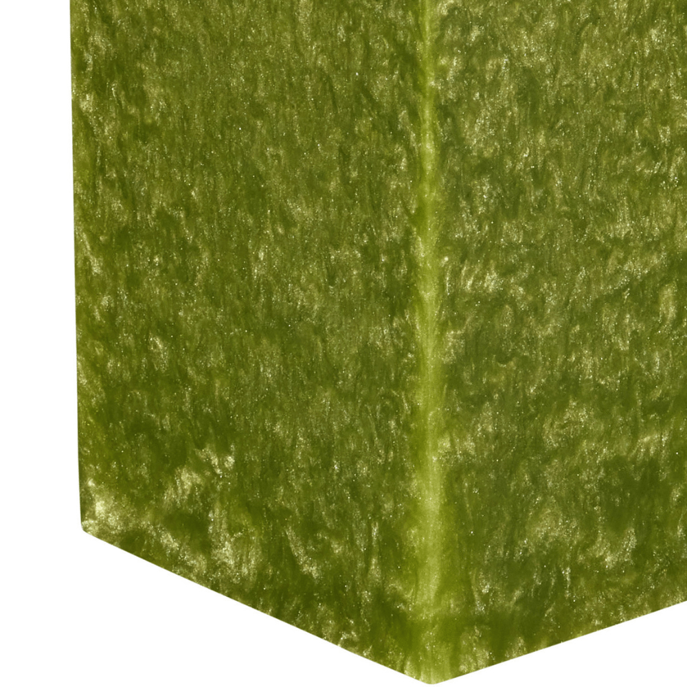 The Nova Object Set includes two sculptures with swirling surfaces created when pearlescent powder was mixed with composite to create the organic patterning. The mottled treatment covers each of the surfaces of the geometric decorative accessories. The large sculpture stands 10.25 inches tall while the small one is 8 inches high.