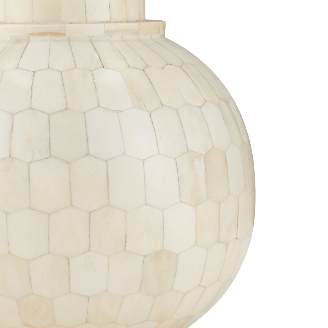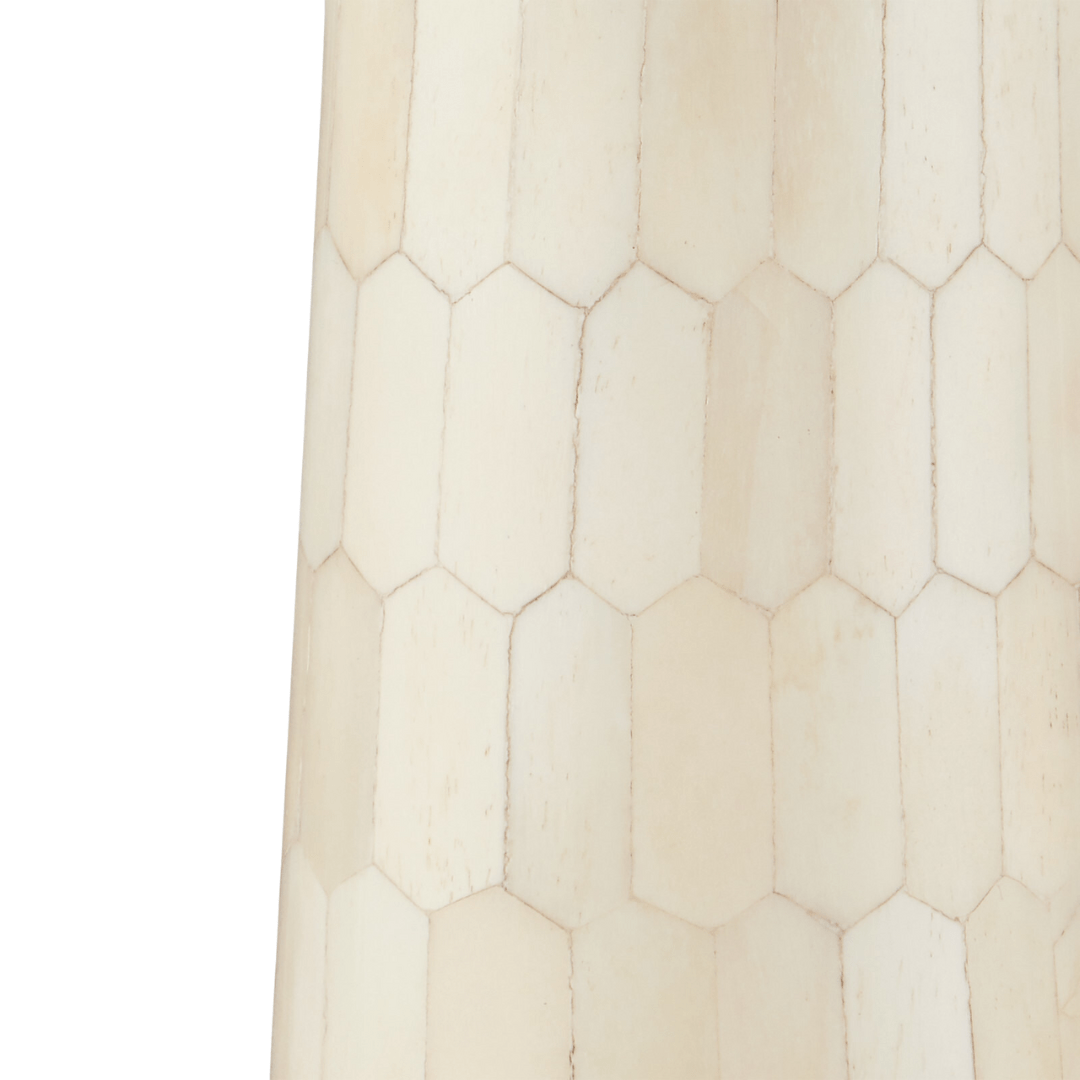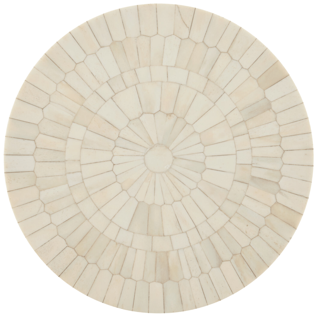 The Osa Drinks Table is a work of art, with its surface covered in over 400 pieces of natural bone that were ground into picket-tile shapes before being applied. The precision required to place the pieces so perfectly is a painstaking process. The plinth base on which the ivory drinks table sits is also covered in bone.