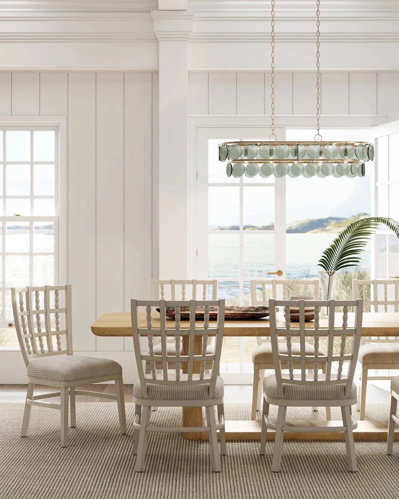 The Settat Chandelier has recycled glass discs dangling from stacked oval ribs in a silver leaf finish. This design is light and airy thanks to the gleaming finish, the minimal chains from which it hangs, and the reflectivily of the glass. The silver chandelier will also introduce a subtle texture to a space given the whorls inherent in the recycled material, which gleams beautifully when the lights are switched on.