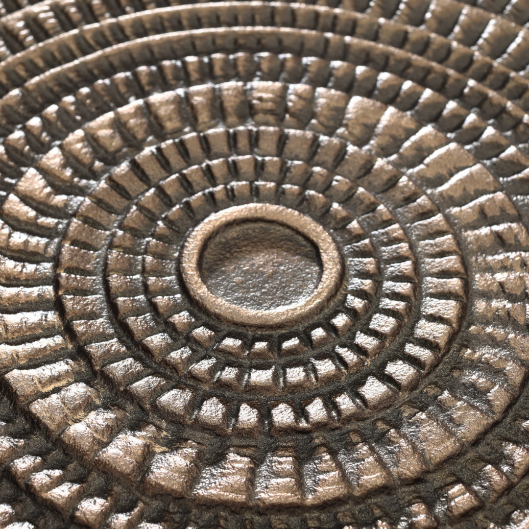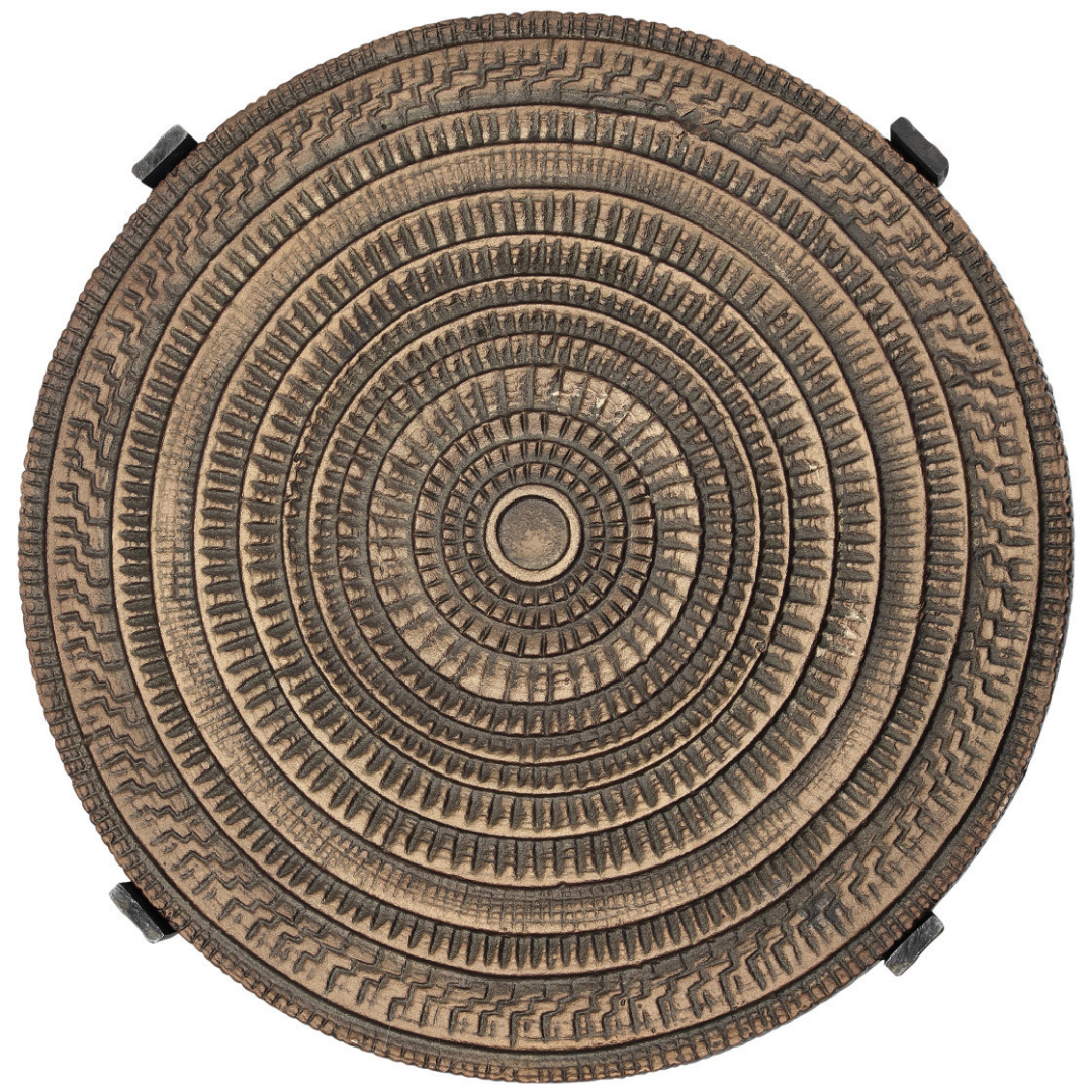 The powerful texture that can be created in cast aluminum is evident in the Unity Accent Table, which has a top swirling with a toothy concentric pattern covered in an antique brass finish. A dark bronze finish on the frame gathers into zig-zagging indentions to bring the legs the appearance they have been hammered. The tabletop was inspired by a found piece of wall art, which was appealing for its strong Bronze Age feel. Because it is made of an artisanal material, its surface may vary slightly from table to table.