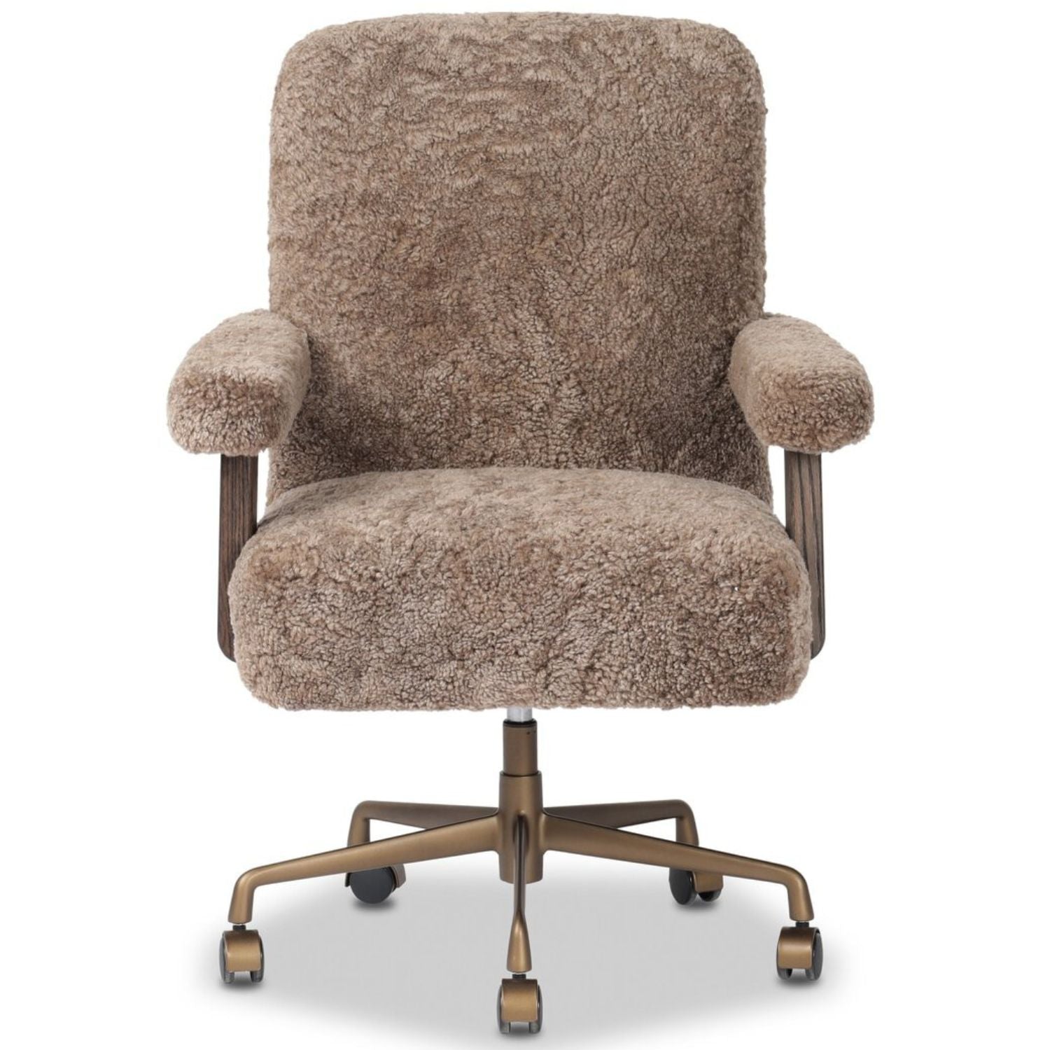 A large, comfort-driven desk chair of taupe shearling tops a 360-degree swivel, for a luxurious take on office styling.