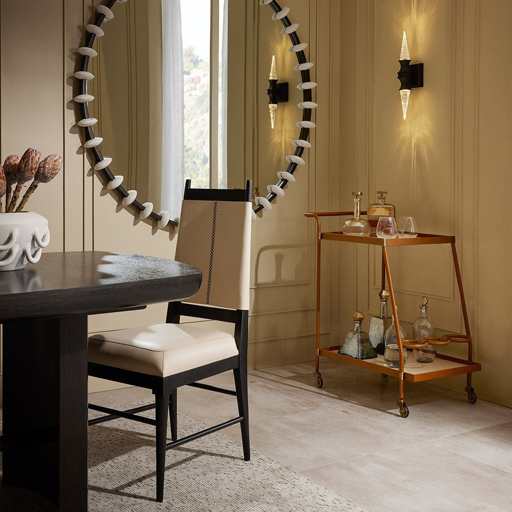 The traditional design of high back dining chairs gets a modern update with the Keegan. The solid walnut wooden frame presents a morel leather that wraps the back in a sling-like fashion and pillows the seat. Both the plush seat and wrapped back feature intricate stitched details. Wood will vary.