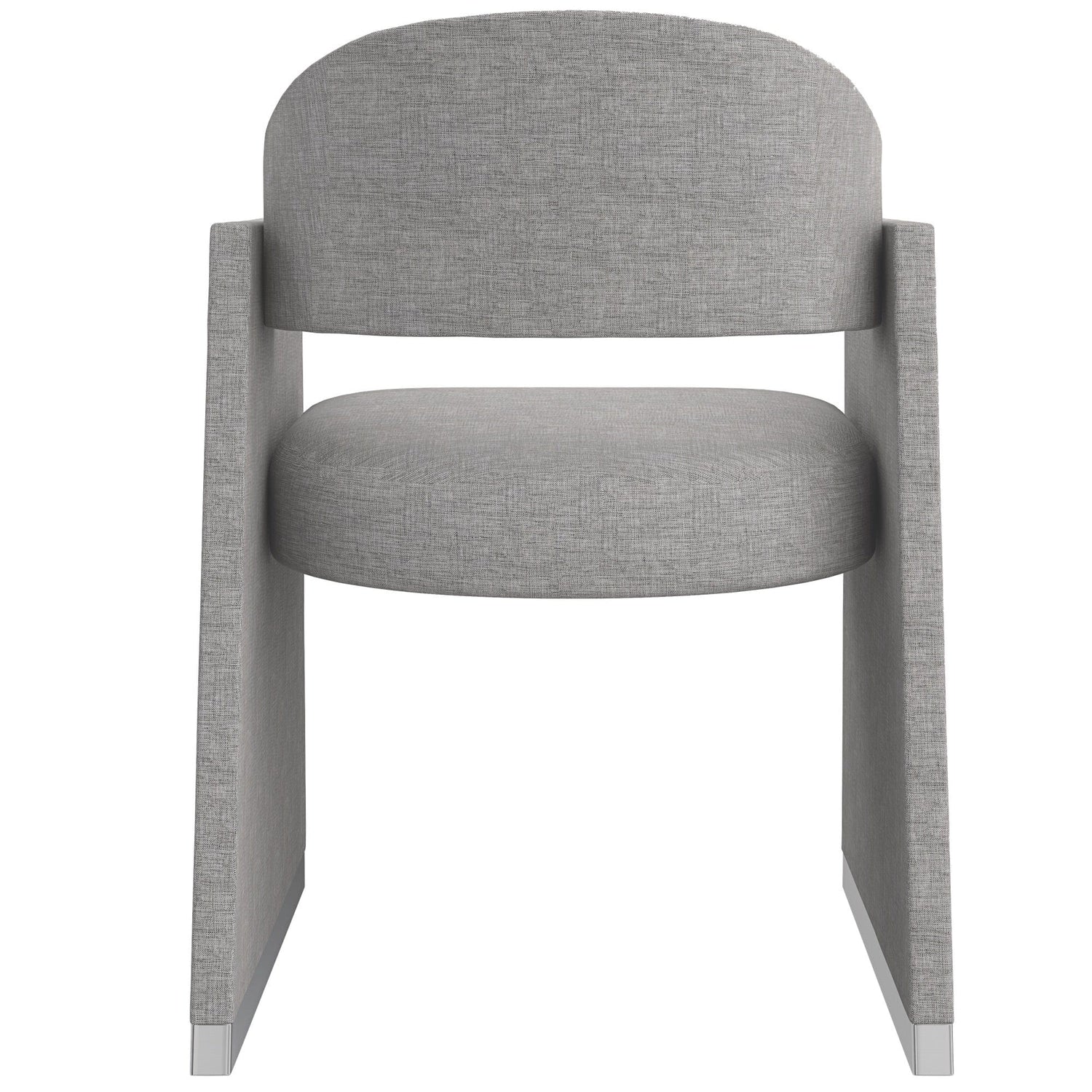 A playful intersection of straight lines and curves, this dining chair makes a sophisticated statement. Dressed in a shimmering gray metallic woven, its geometric shape features trapezoidal side arms with a rounded back and seat that appear to float within two perpendicular planes. For reflection: Polished Silver caps on the legs lend a note of distinction and add to its floating appearance.