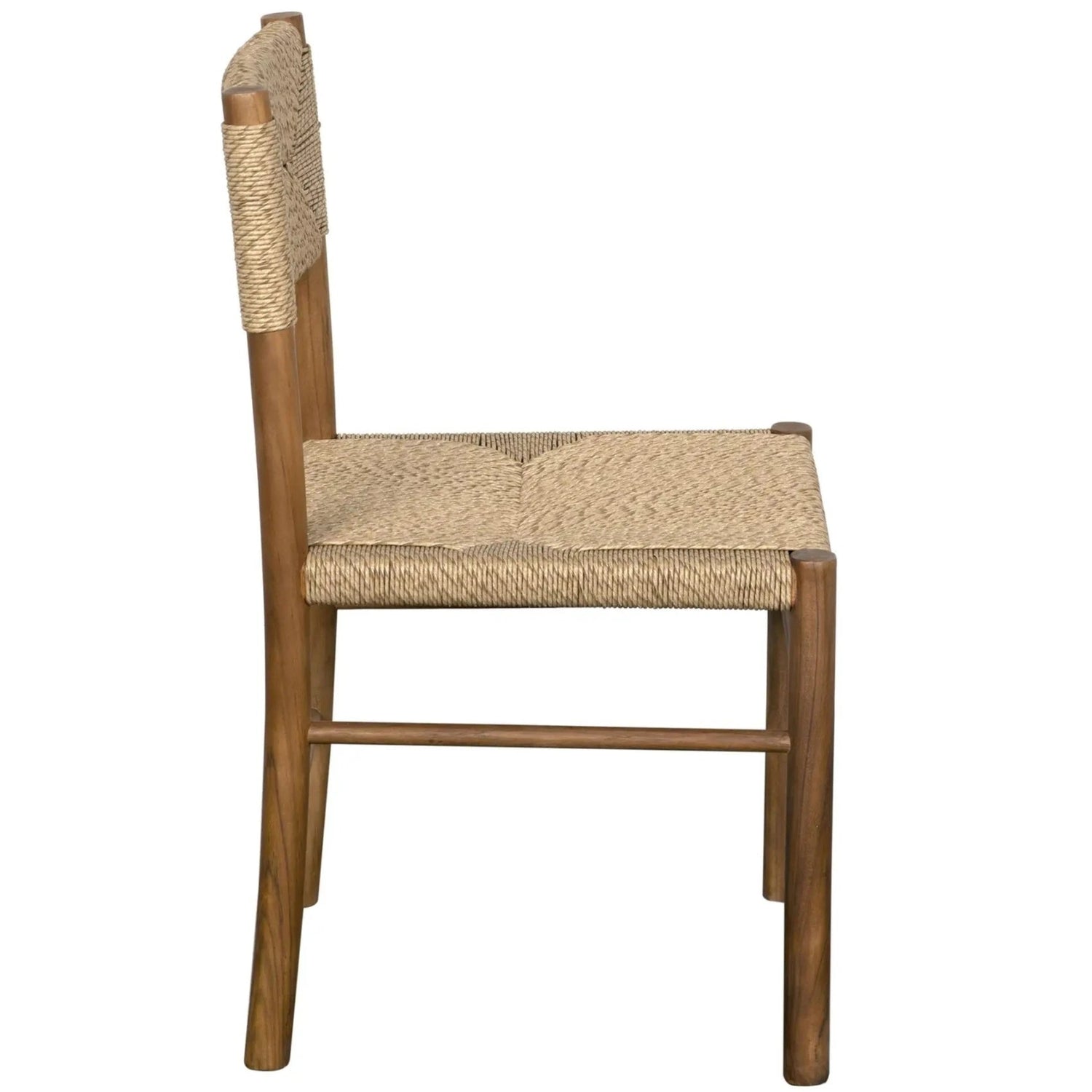 With modern and clean tubular style construction, these sleek Teak chairs feature a faux (synthetic) veriegated seagrass woven seat and back. Simple lines, and organic vibes make these an easy placement.