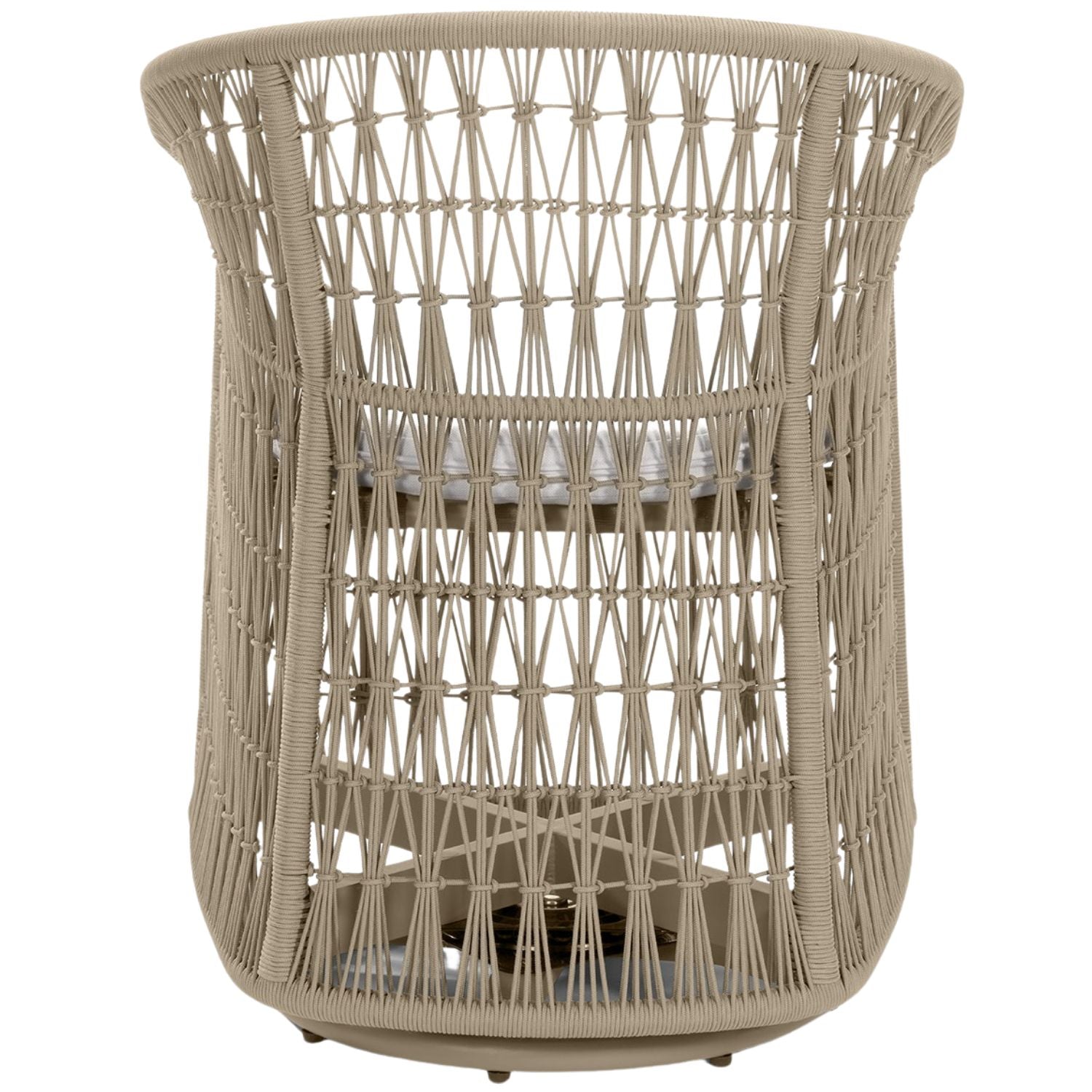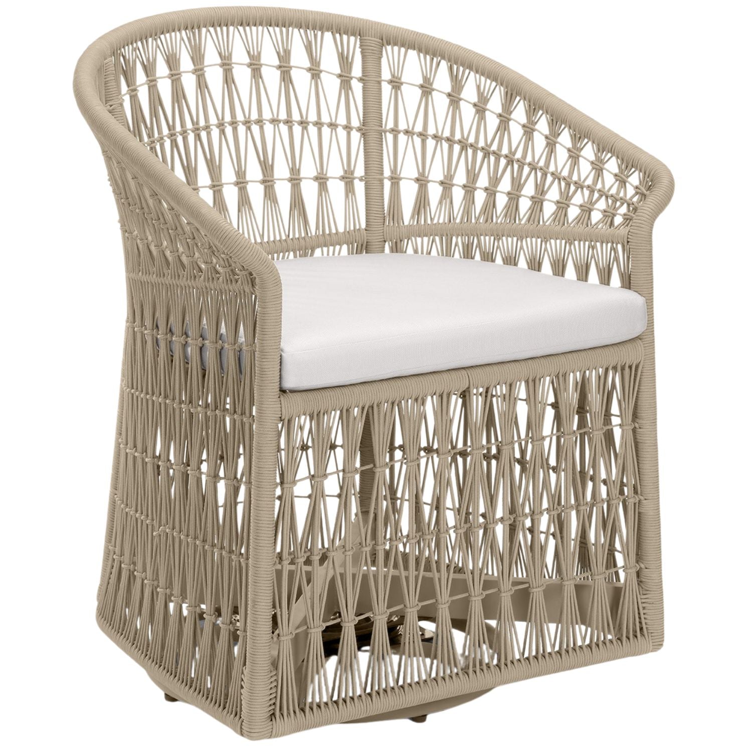 All-weather rope is woven to form the durable and elevated Meriah swivel dining chair. Complete with a seat cushion that perfectly fits into its sloping arms, this piece is designed to blend comfort and class. The seat cushion comes upholstered in our Alsek White or can be upholstered with one of our luxe upholstery fabrics or COM.