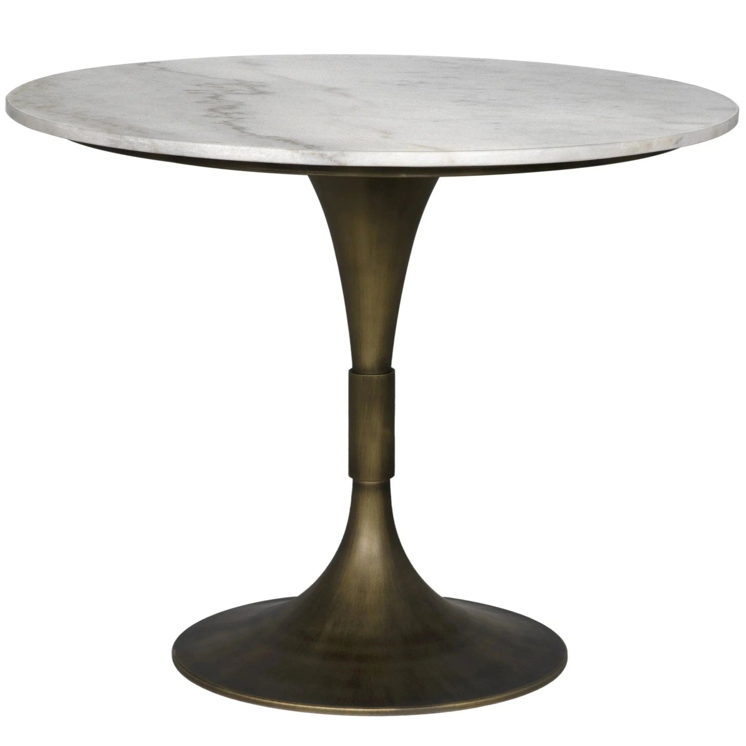 The Jman 36-inch round table combines an elegant and graceful tapered industrial steel base with Aged Brass finish and center band or with a Matte Black finish and Crown Bianco Marble top, unique to each piece. From entry to bistro, this series has many placement options.