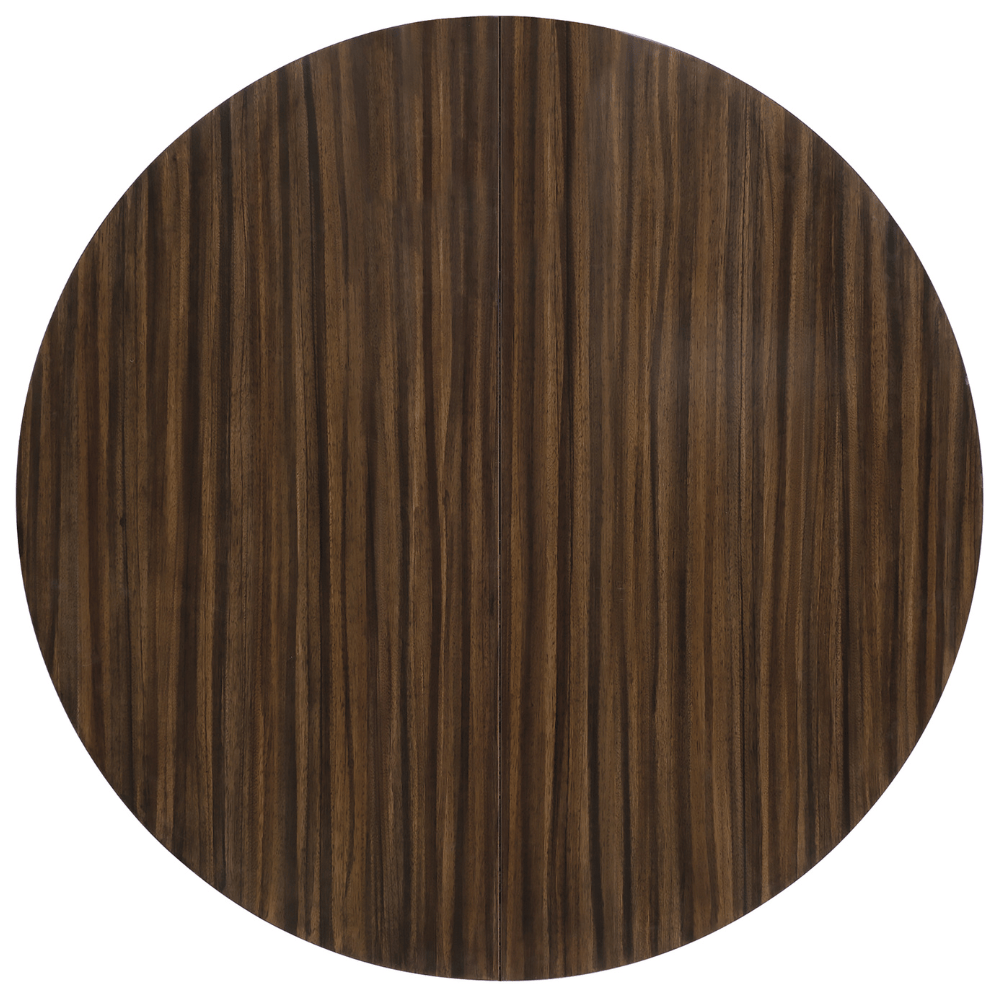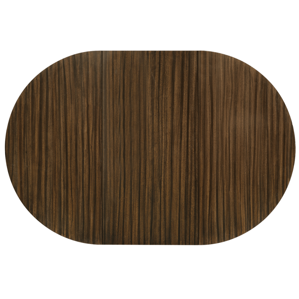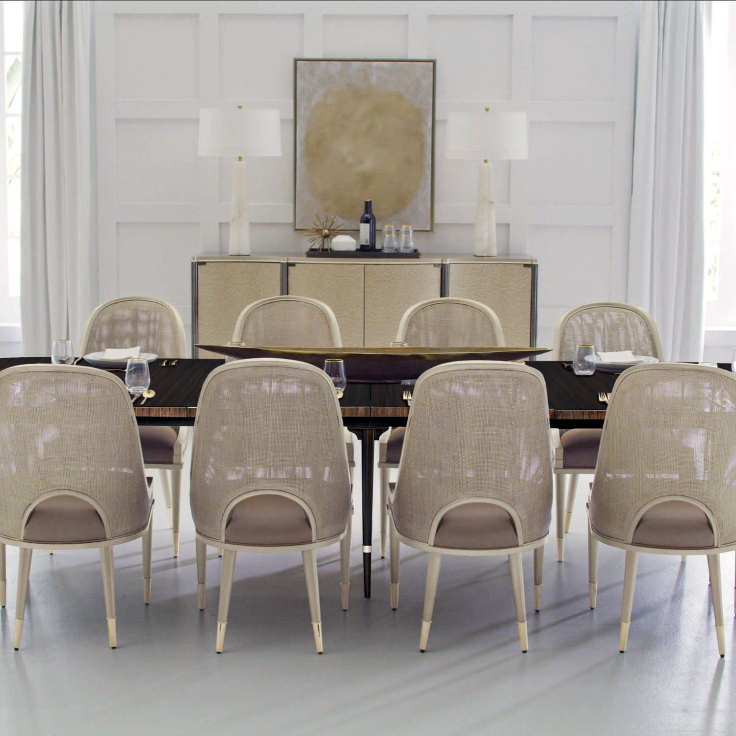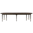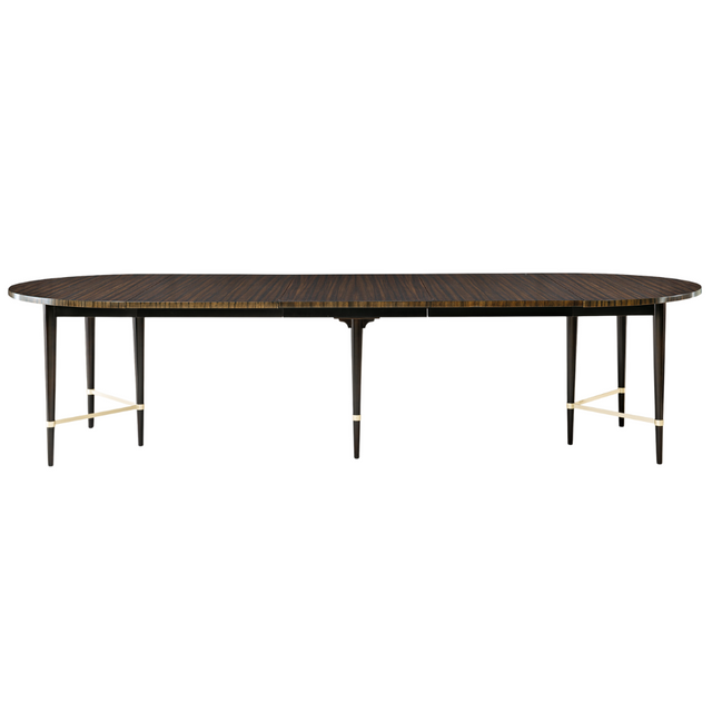 For gatherings small or large, this bold statement-making dining table will sweep you off your feet. Its contemporized traditional profile is designed to accommodate groups from four to 12. Stunning quartered Paldao wood distinguishes the tabletop and is finished in a rich shade of Saddle while a deep Black Saddle finish adds depth to its legs and apron. A Neutral Metallic highlights its stretchers for an added element of glamour. As your party grows, this impressive table can be extended to 144 inches with the addition of four 24-inch leaves.