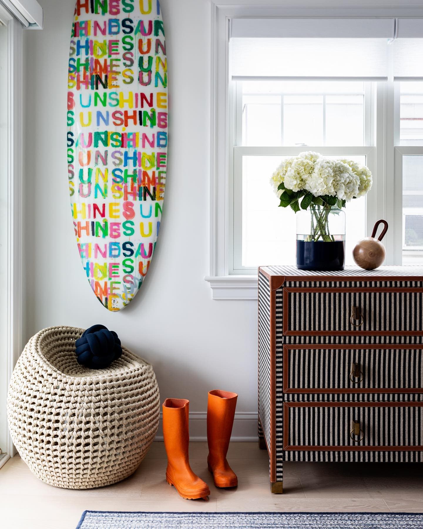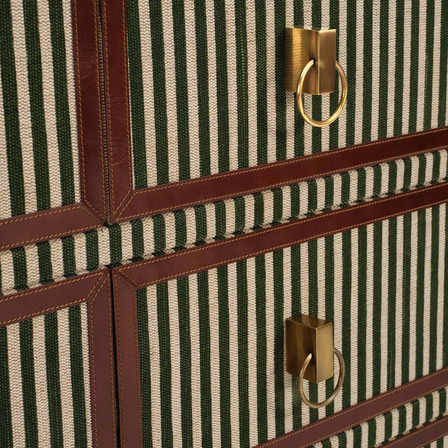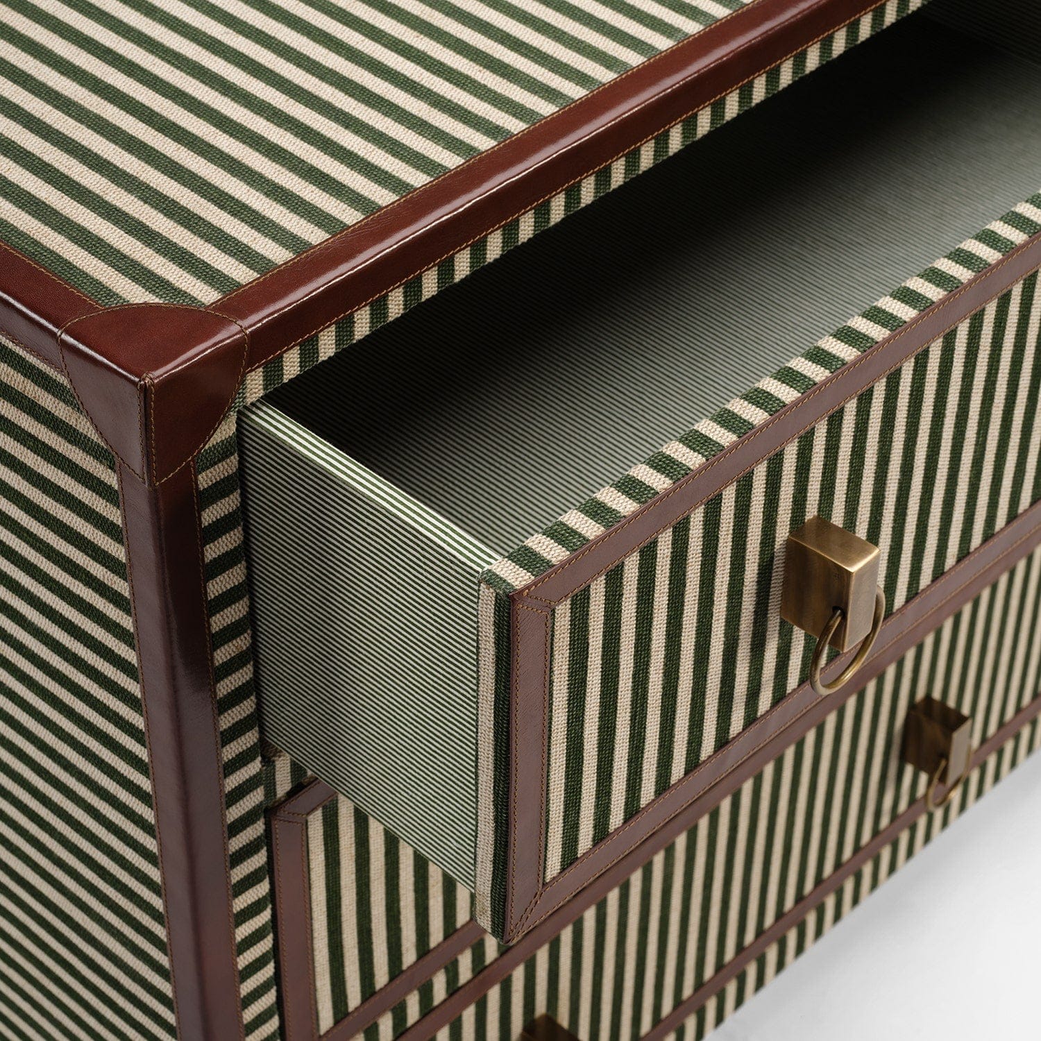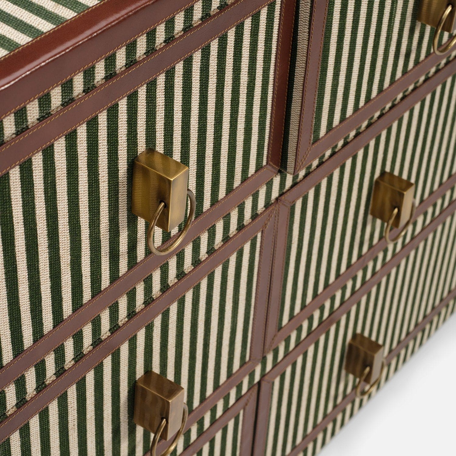 Striped pattern evokes a nautical charm while camel leather detailing highlights the tables' soft corners. They have a casual preppy feel, evoking summers in Nantucket. Now available in a new size!
