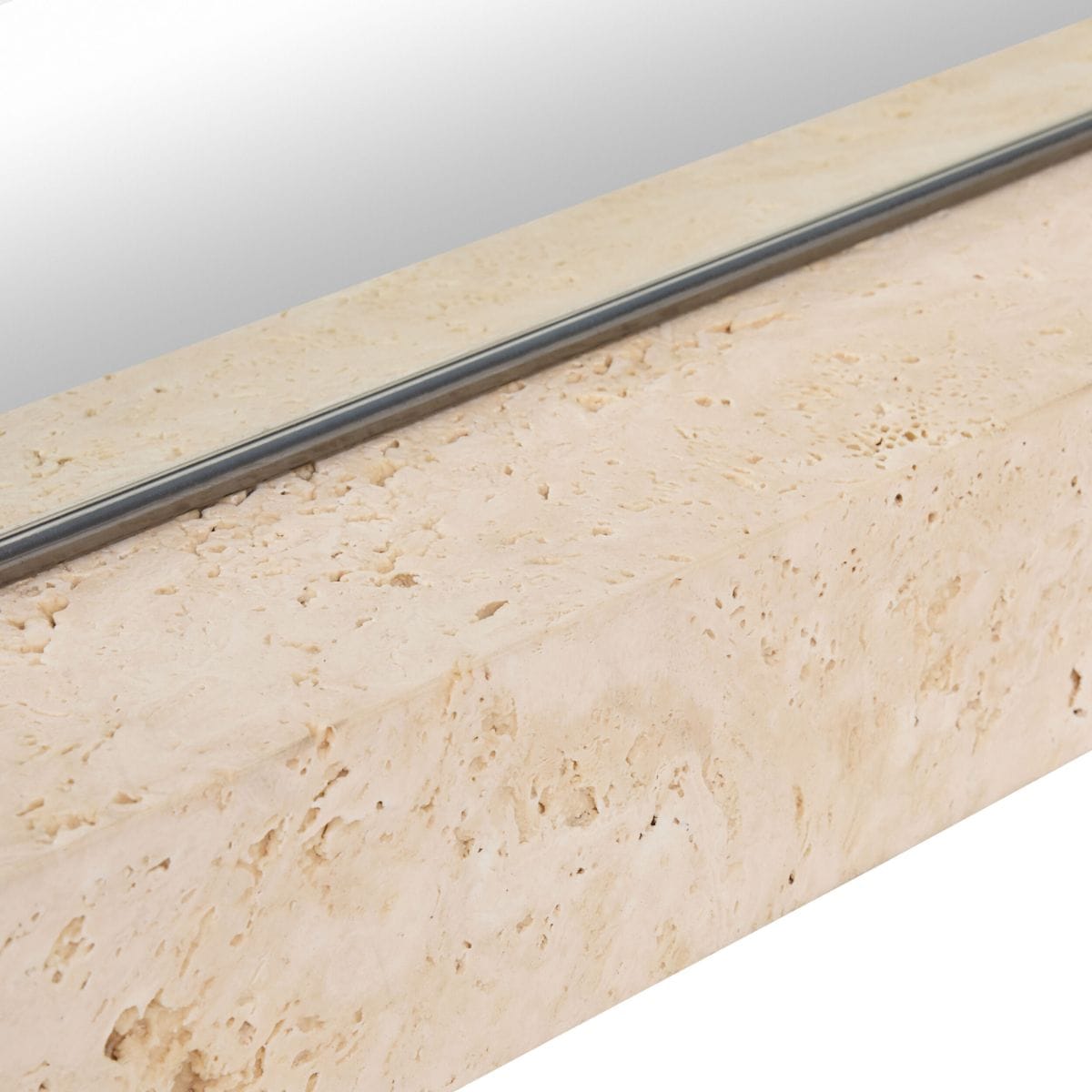 The Zuri Floor Mirror rises from a solid travertine base like stone lifted by desert wind. The tall, leaning mirror is framed in plated steel, its surface flush to the stone. It balances mass and reflection, stone and light. To see yourself clearly, you must first stand on solid ground.
