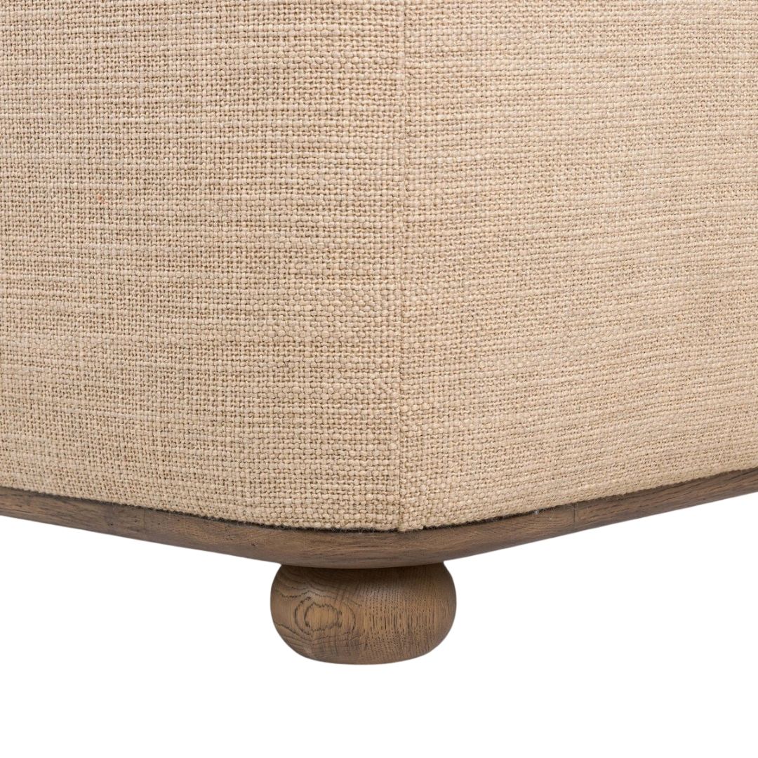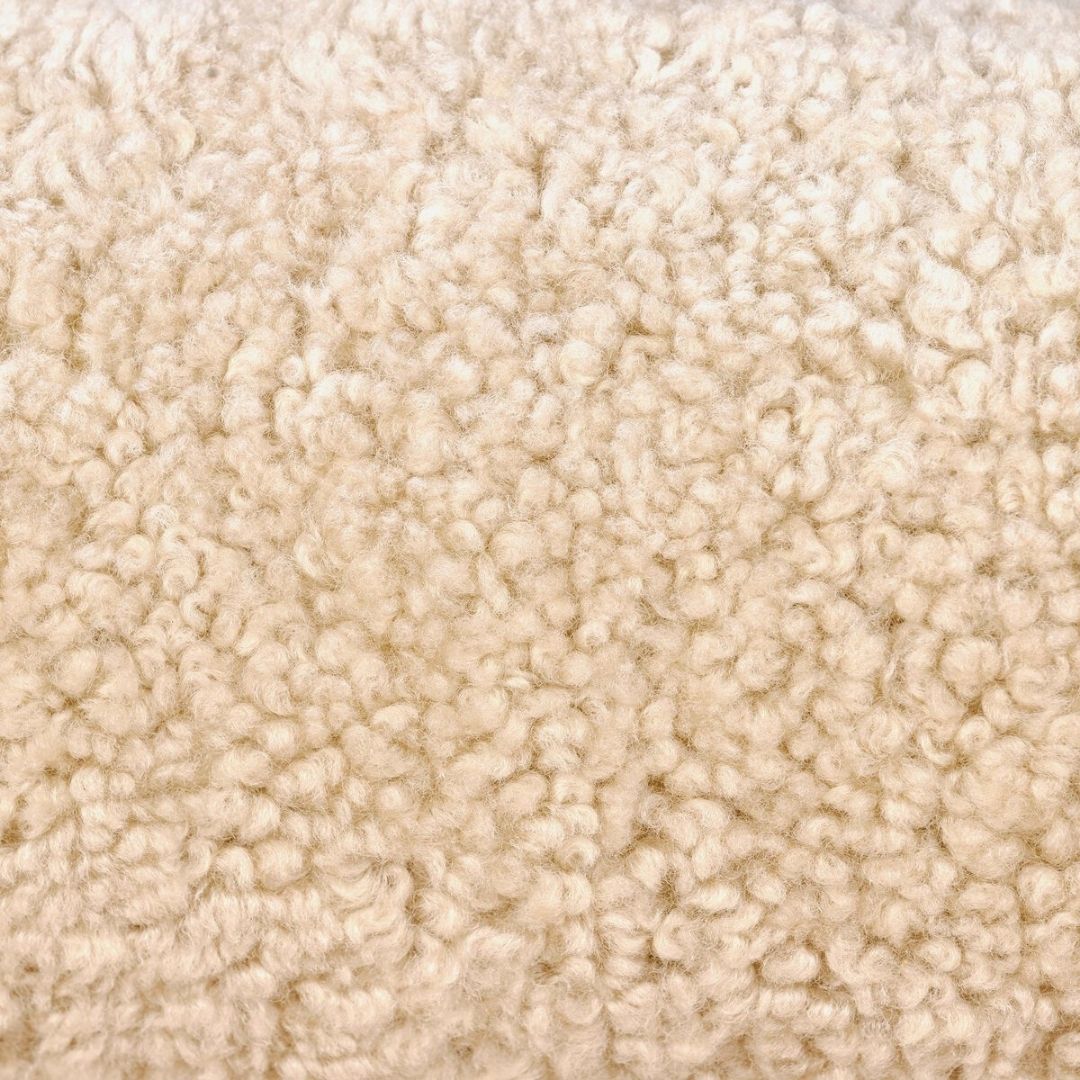 Enveloping head to toe comfort in a modern, pill-shaped outline with asymmetrical cutouts on either end for a cozy reading nook, entryway or accent piece. Crafted from solid oak and upholstered with beige shearling for extra texture. Finished with bolstered pillows and bun-shaped legs .