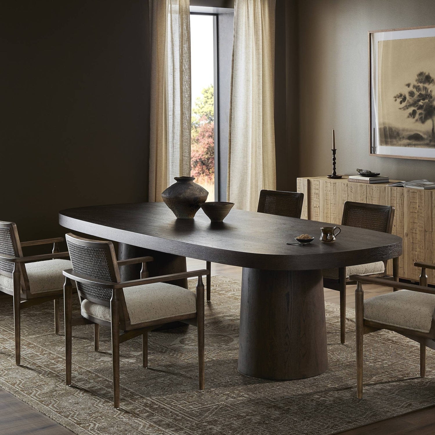 Smooth and shapely with heavy proportions, exaggerated cylinder legs pair with a softened pill-shaped top, with subtly arched sides. Made from oak veneer with a rustic brown finish, for a warm, welcoming look.
