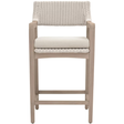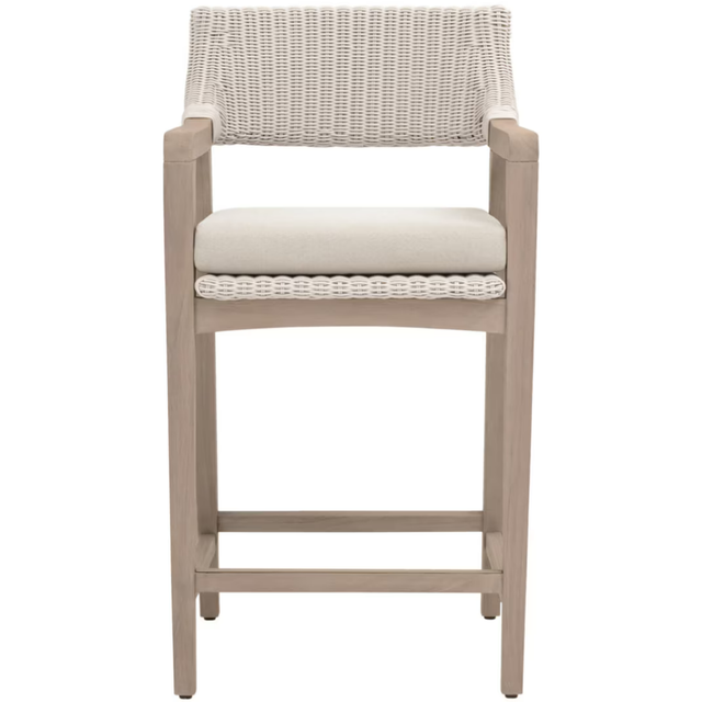 Elevate your outdoor living experience with the Lucia Outdoor Counter Stool by Essentials For Living. This transitional-style counter stool boasts a pure white synthetic wicker and teak frame, skillfully crafted from solid washed ever teak wood, synthetic wicker, and aluminum for lasting durability. With dimensions of 21.5" wide, 21" deep, 39.75" high, the stool includes a removable seat cushion made from 100% olefin fabric and foam. The seat height is ideal for many counters or bar tables, measuring 28.5". The high-performance, durable stone fabric is suitable for outdoor use and ensures easy maintenance. However, the stool and cushion should still be stored away in extreme conditions. The frame is completed with an L-shaped metal footrest cover, adding protection to the footrest. Embrace the versatility and charm of this counter stool in your home or outdoor haven.