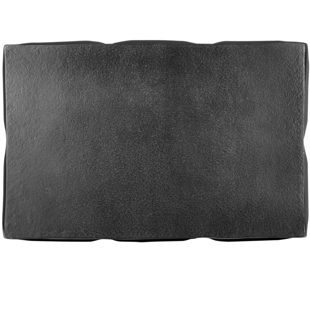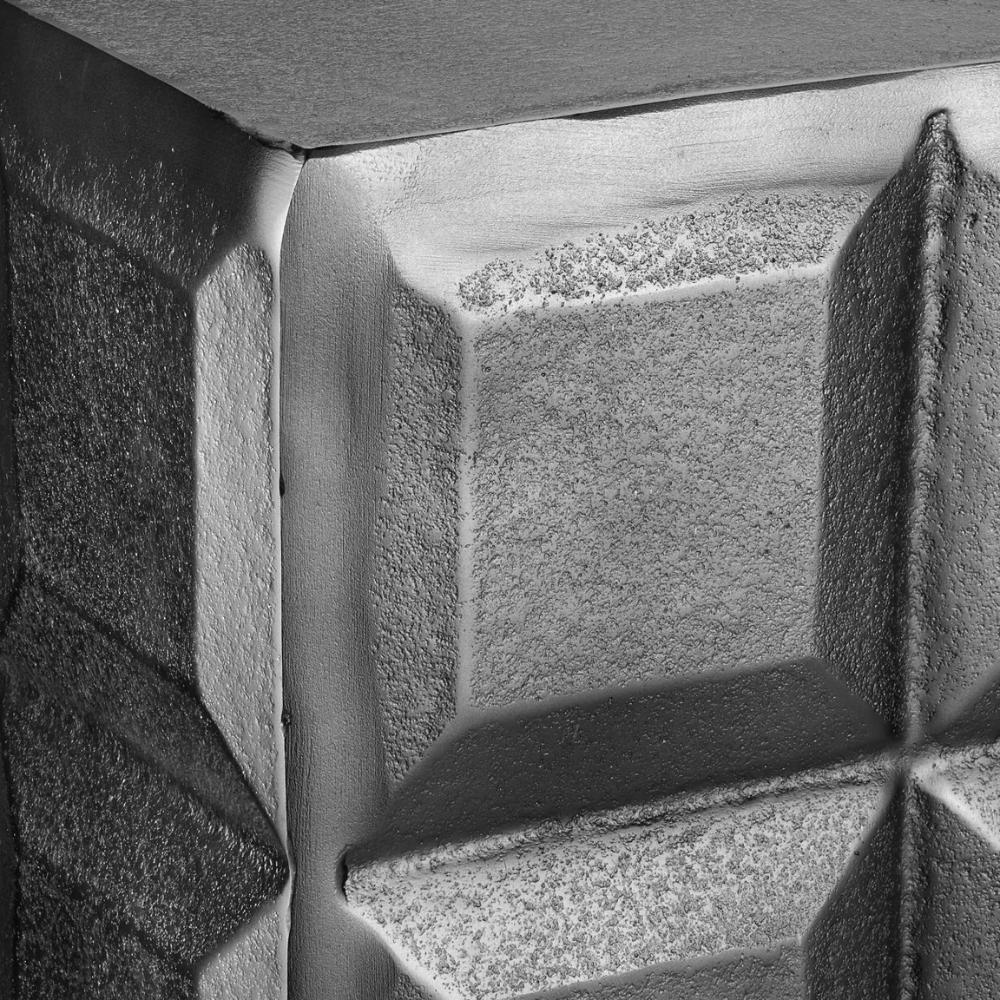 The Bower Side Table is made of cast aluminum finished in black nickel. The columns of squares that flow up toward the top bring the black side table a brutalist feel, which is enhanced by the stippled surface and the matte finish. The Bower would fit well within a number of interior styles, including rough luxe and contemporary.