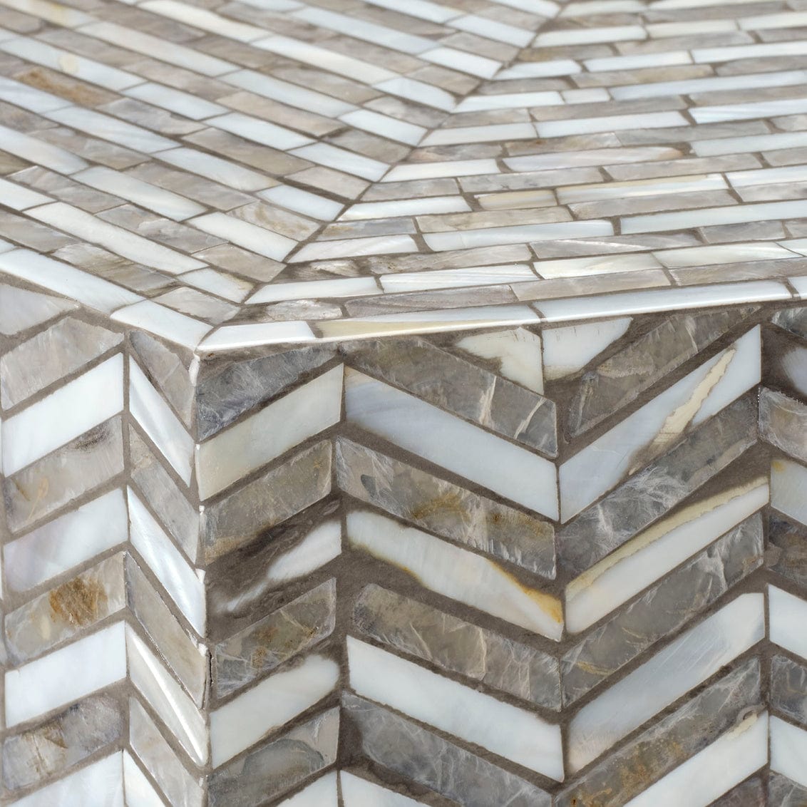 A jewel of the sea, Mother-of Pearl is a natural substance with rich luminescence, and each piece of it is unique. Small, multi-tonal strips of the iridescent material are carefully selected and expertly placed to create the intricate mosaics that cover every inch of these accent tables. Carefully contrasting their opulence with restraint, their geometrical shapes are kept deliberately simple.