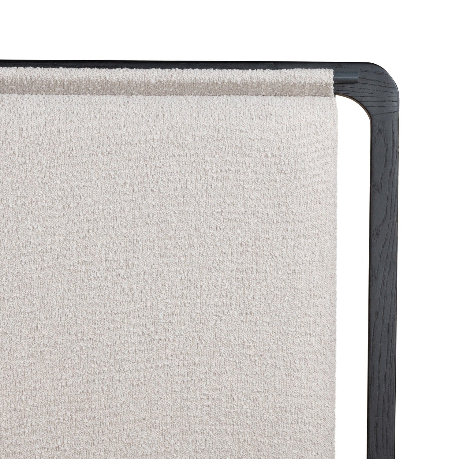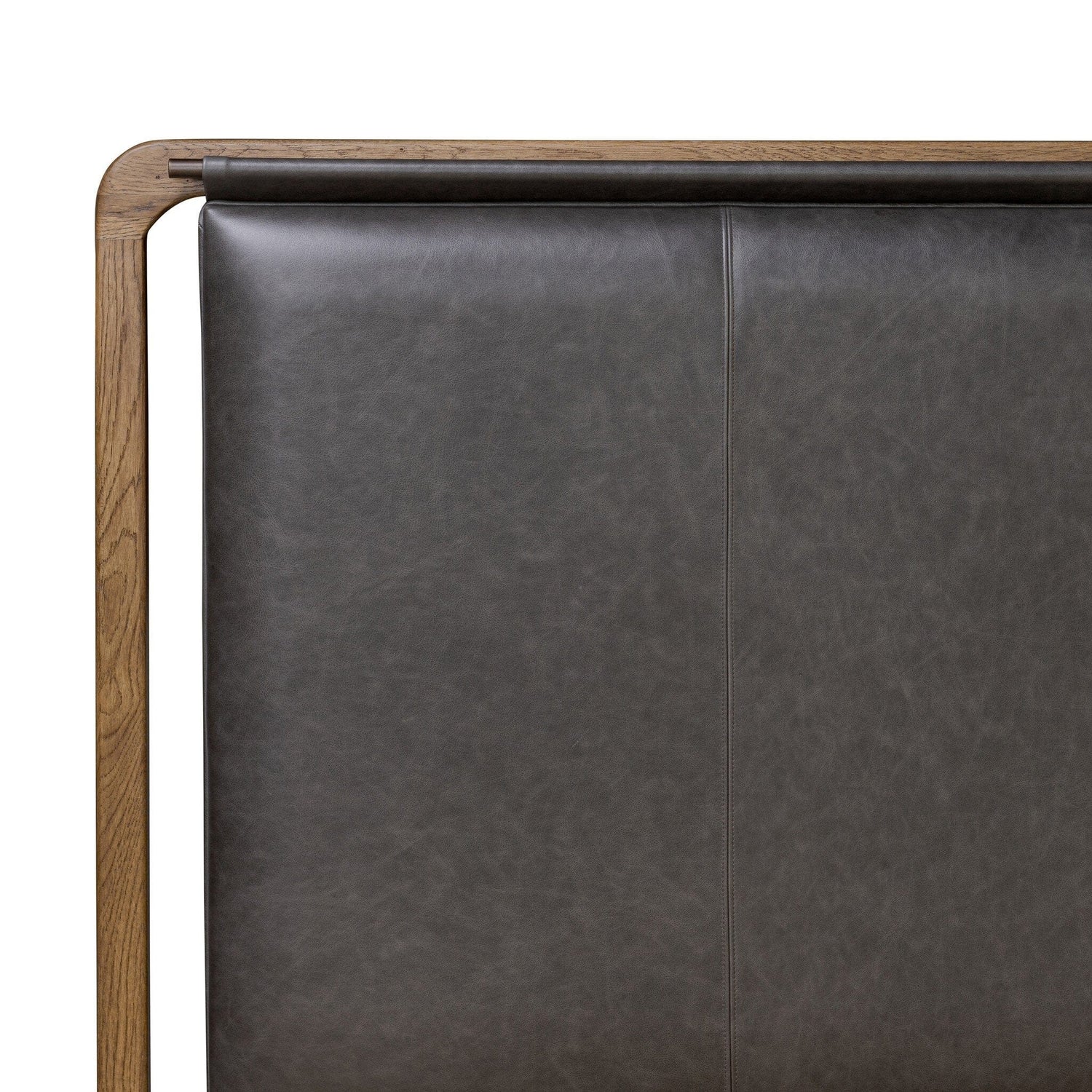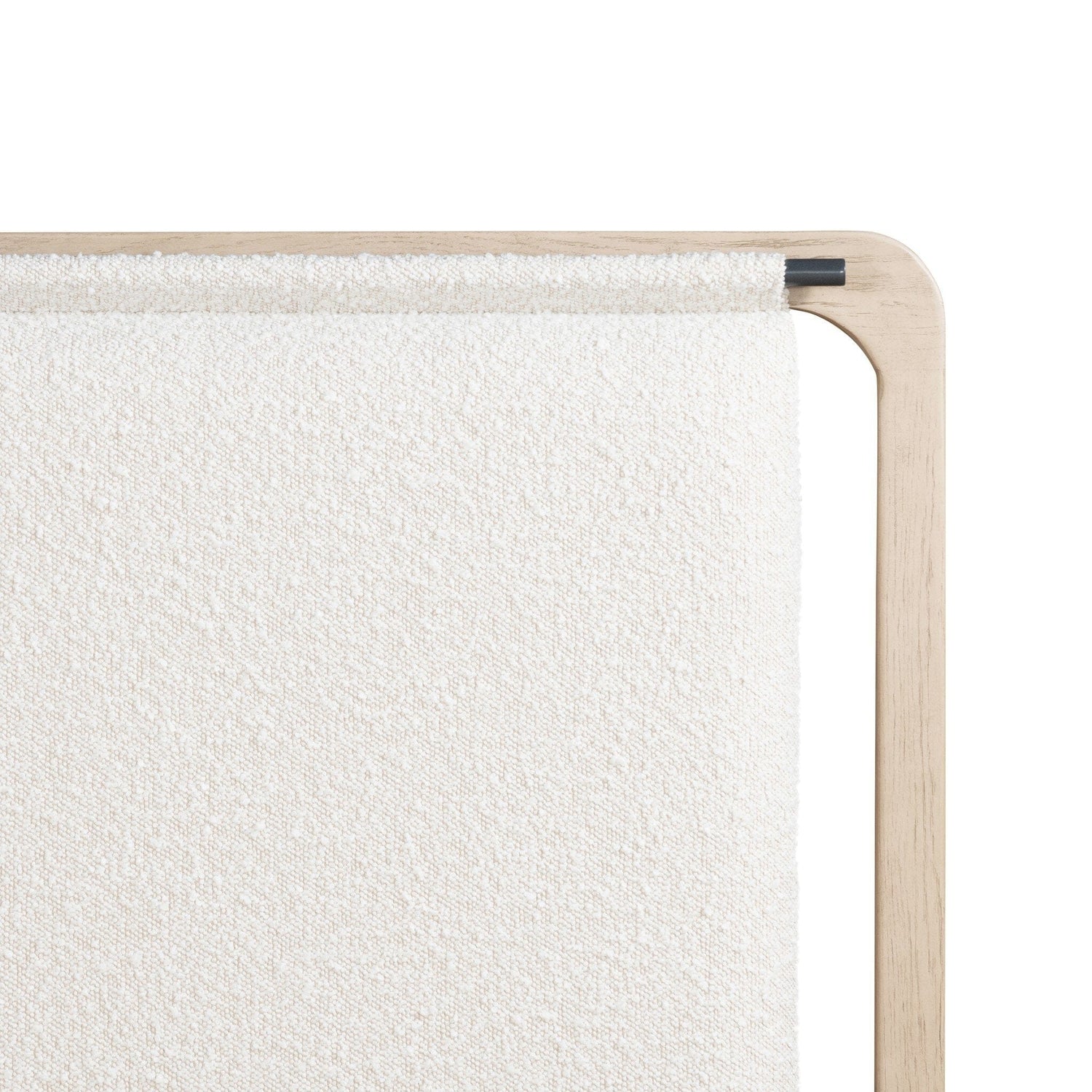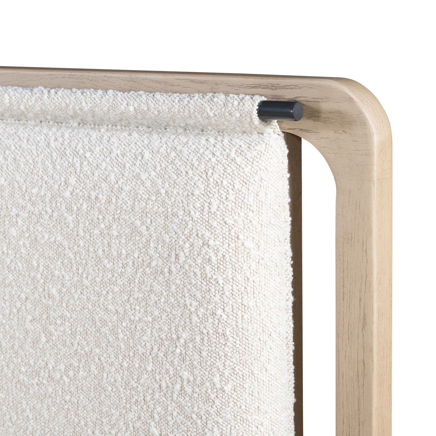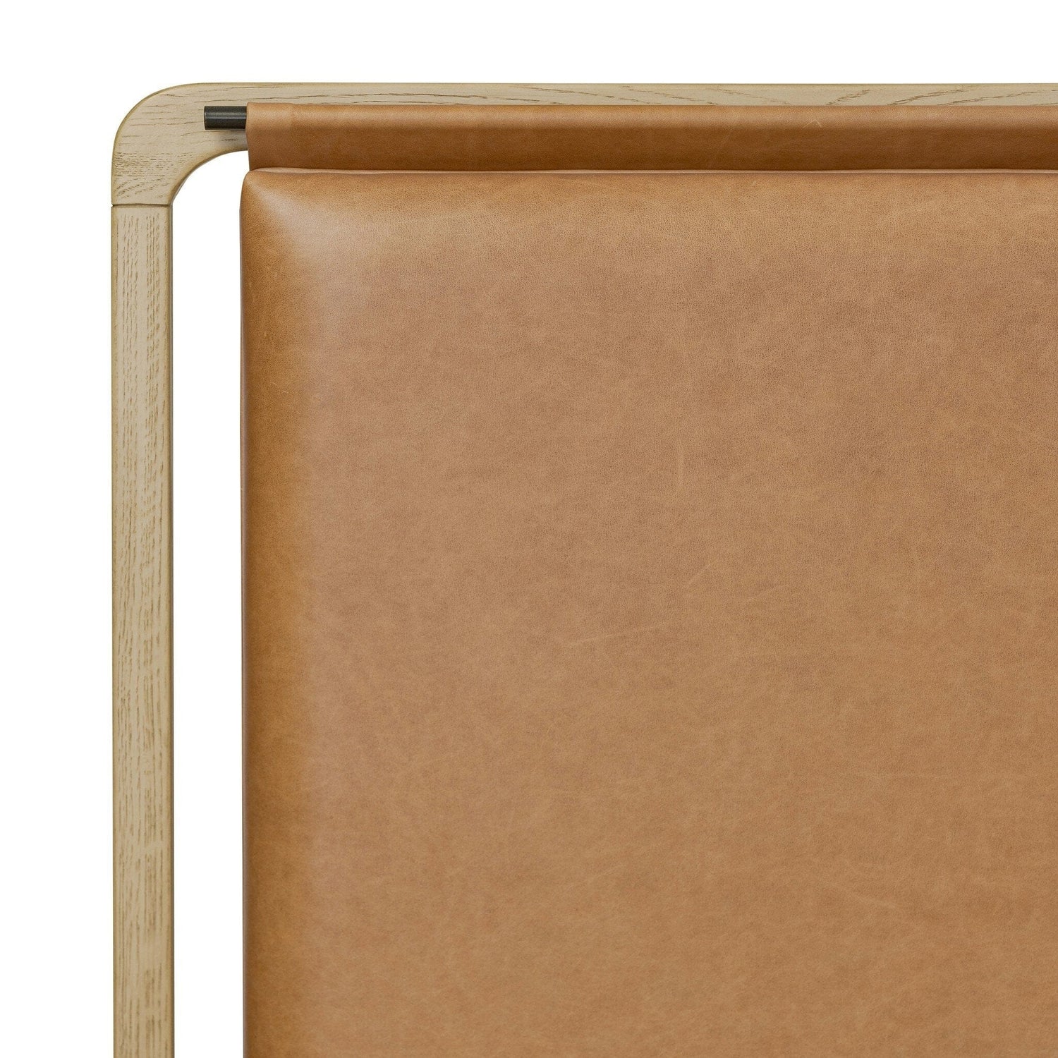 A sculptural take on modern comfort. A sling-style headboard — offered in top-grain leather, high-performance fabric, or textured boucle — appears to float within a solid oak frame, available in a range of finishes. Subtly rounded edges and metal dowel detailing bring a soft, refined touch to the bedroom.