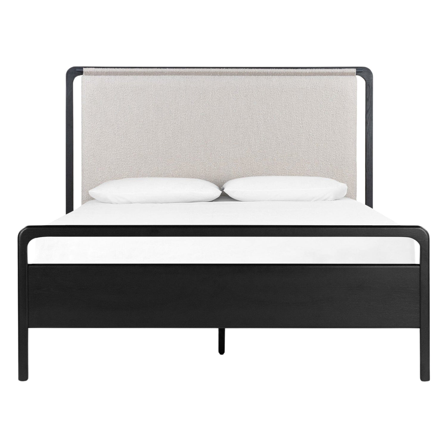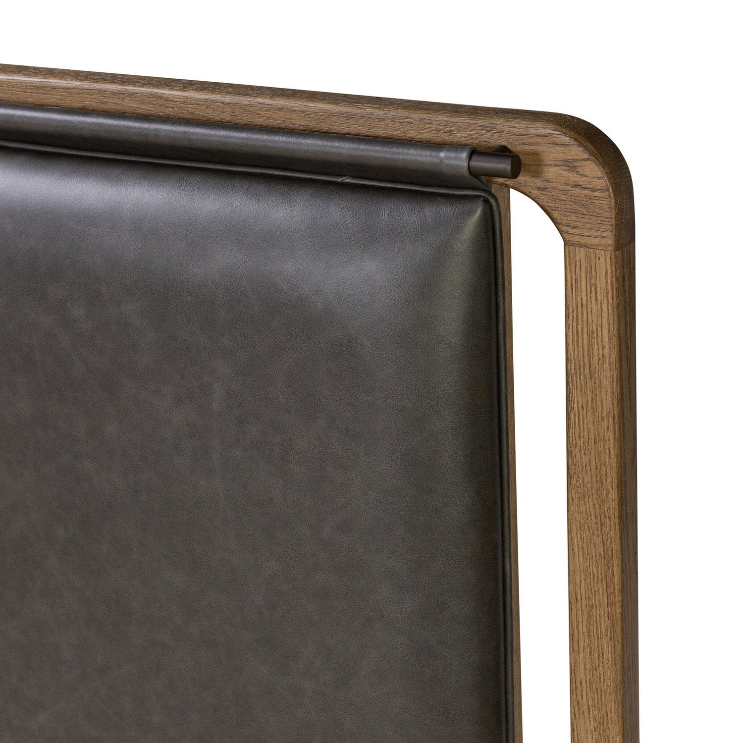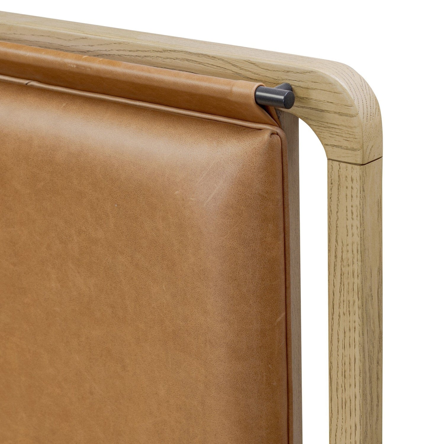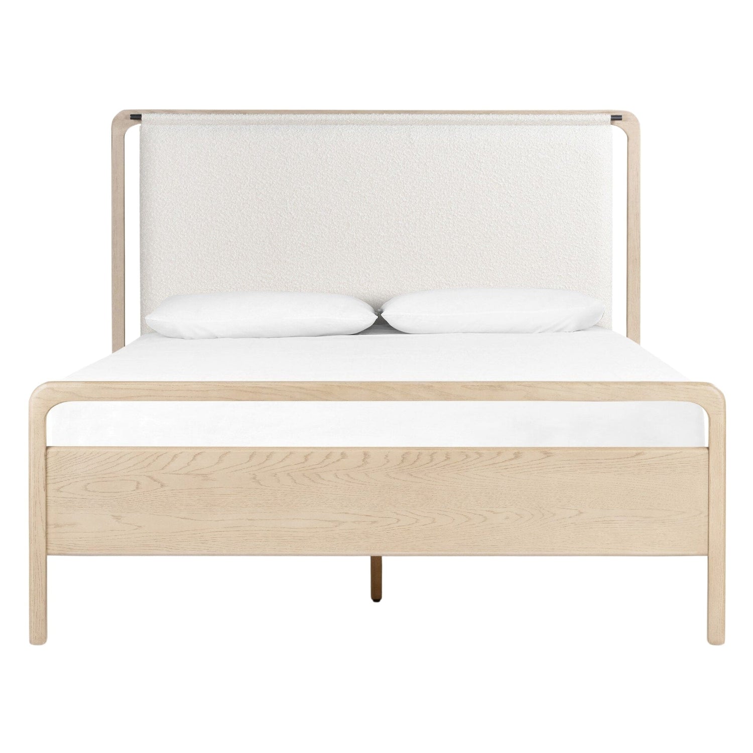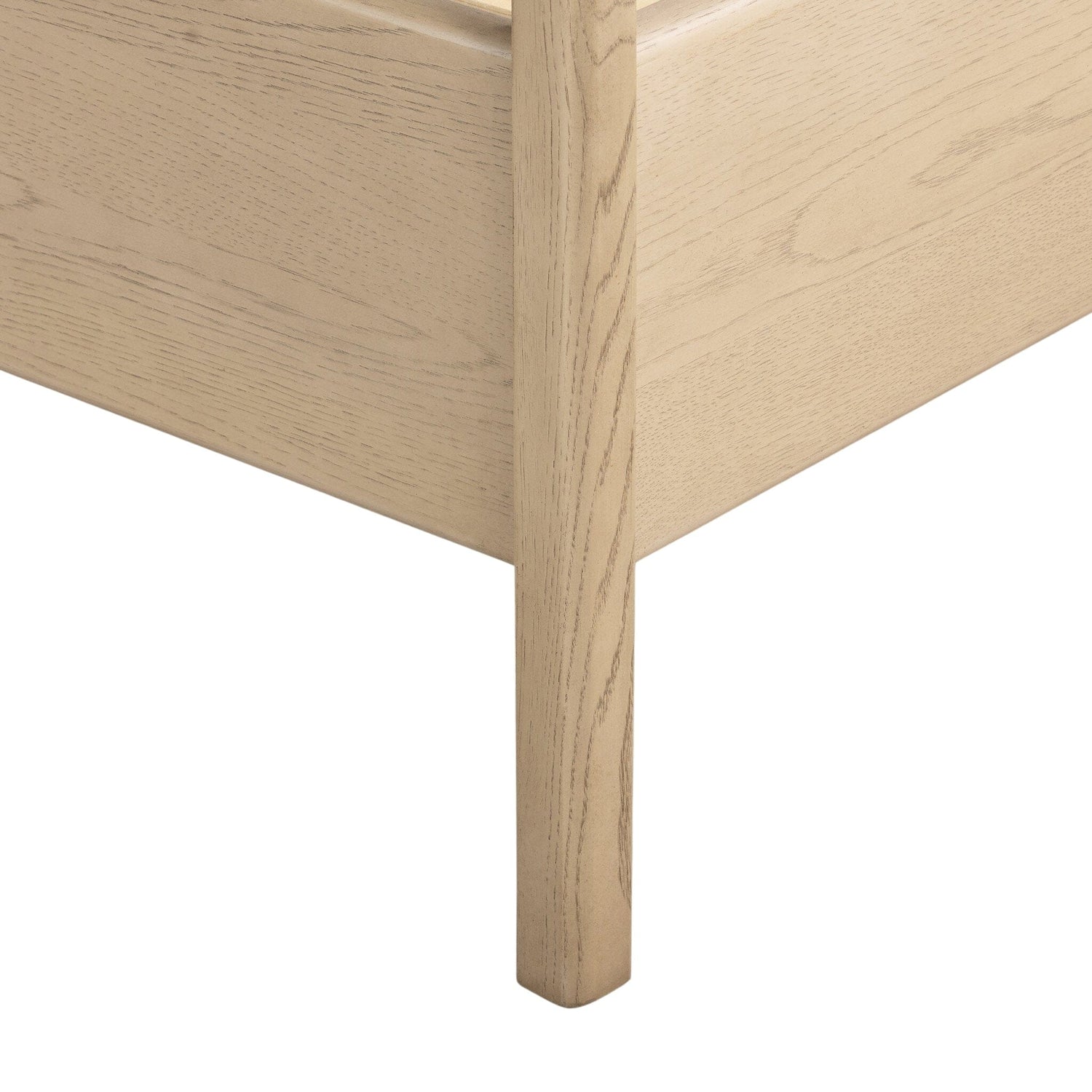 A sculptural take on modern comfort. A sling-style headboard — offered in top-grain leather, high-performance fabric, or textured boucle — appears to float within a solid oak frame, available in a range of finishes. Subtly rounded edges and metal dowel detailing bring a soft, refined touch to the bedroom.