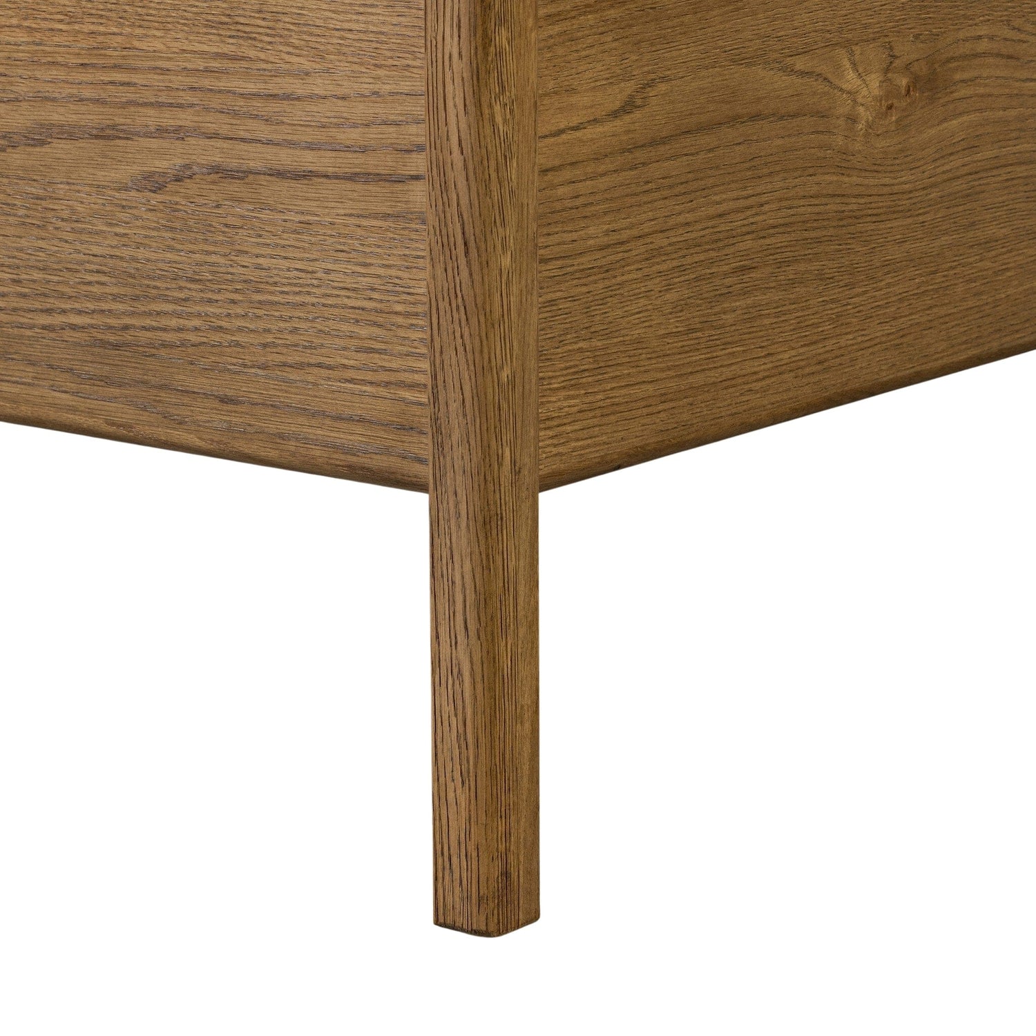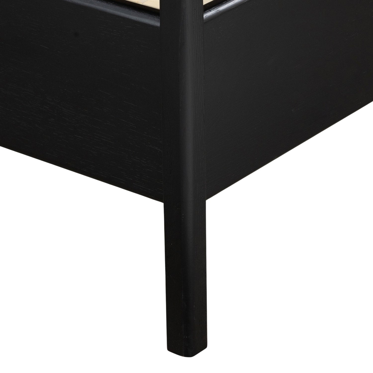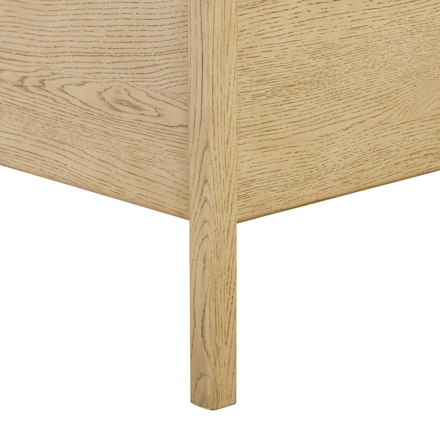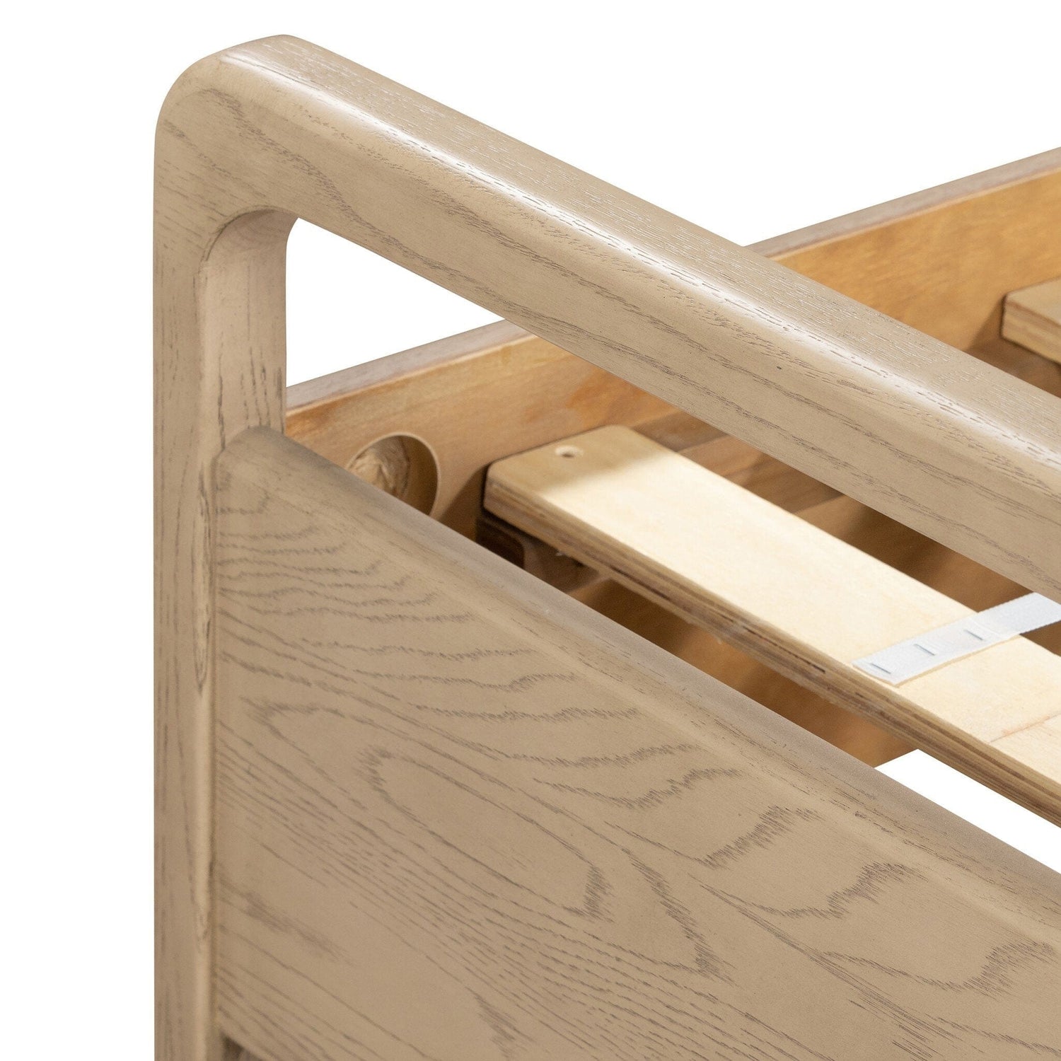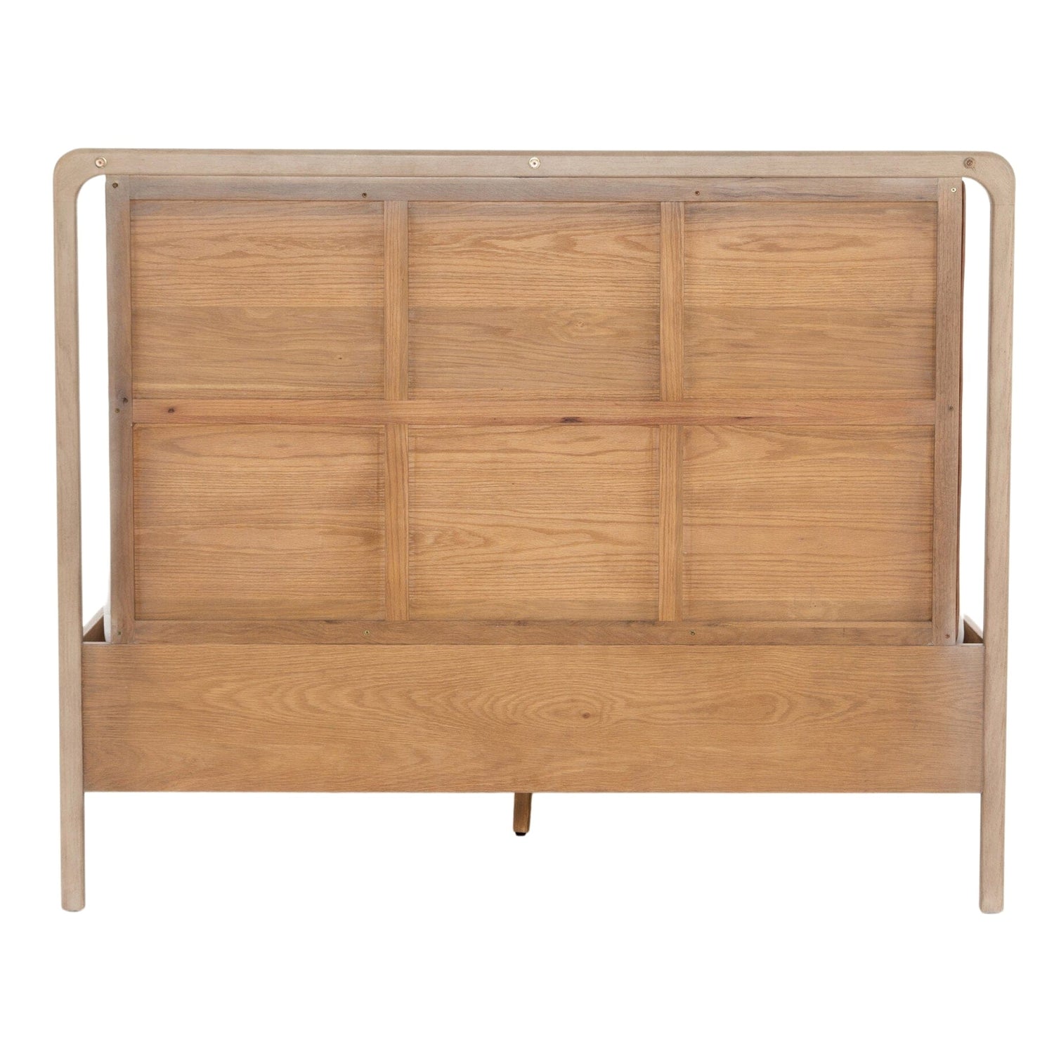 A sculptural take on modern comfort. A sling-style headboard — offered in top-grain leather, high-performance fabric, or textured boucle — appears to float within a solid oak frame, available in a range of finishes. Subtly rounded edges and metal dowel detailing bring a soft, refined touch to the bedroom.