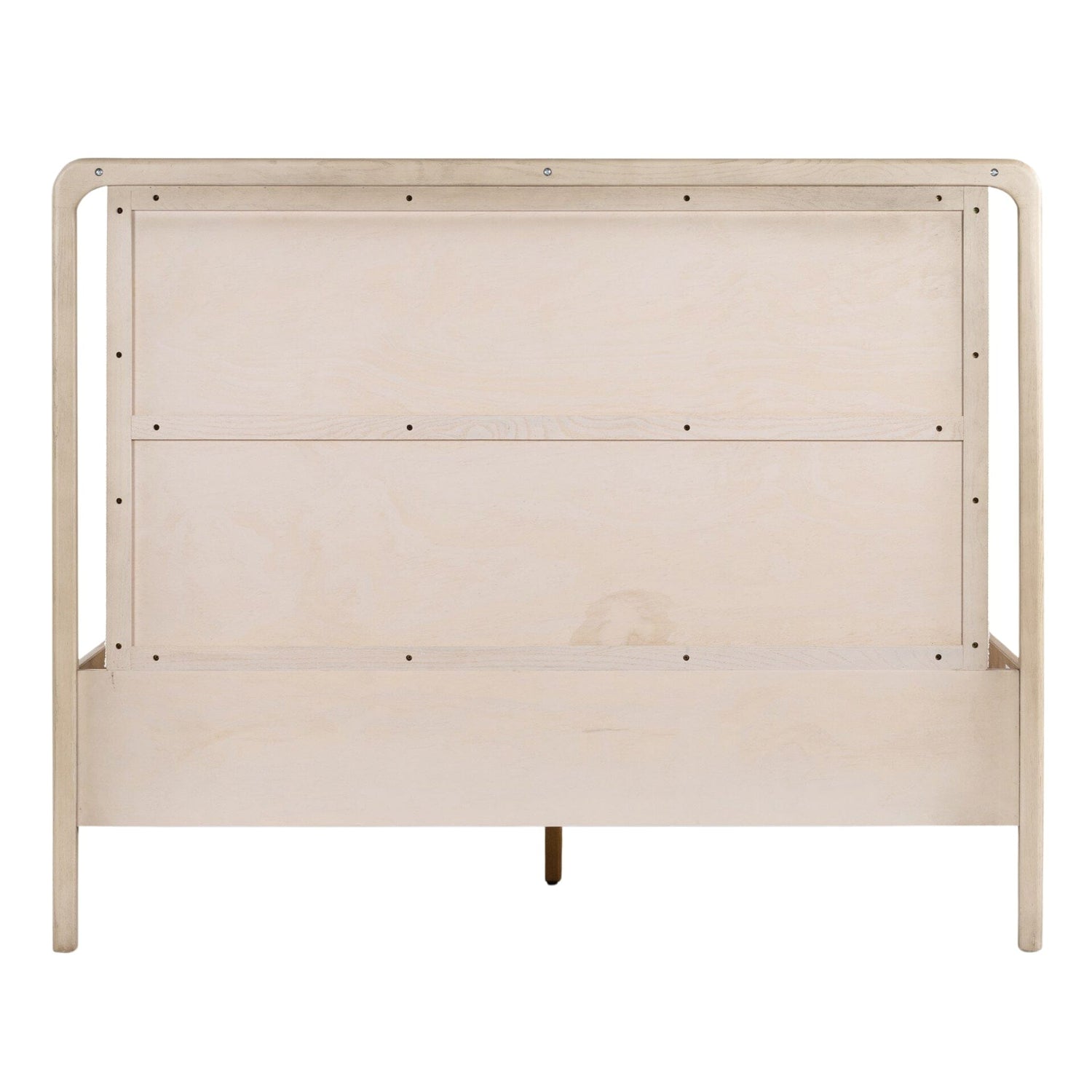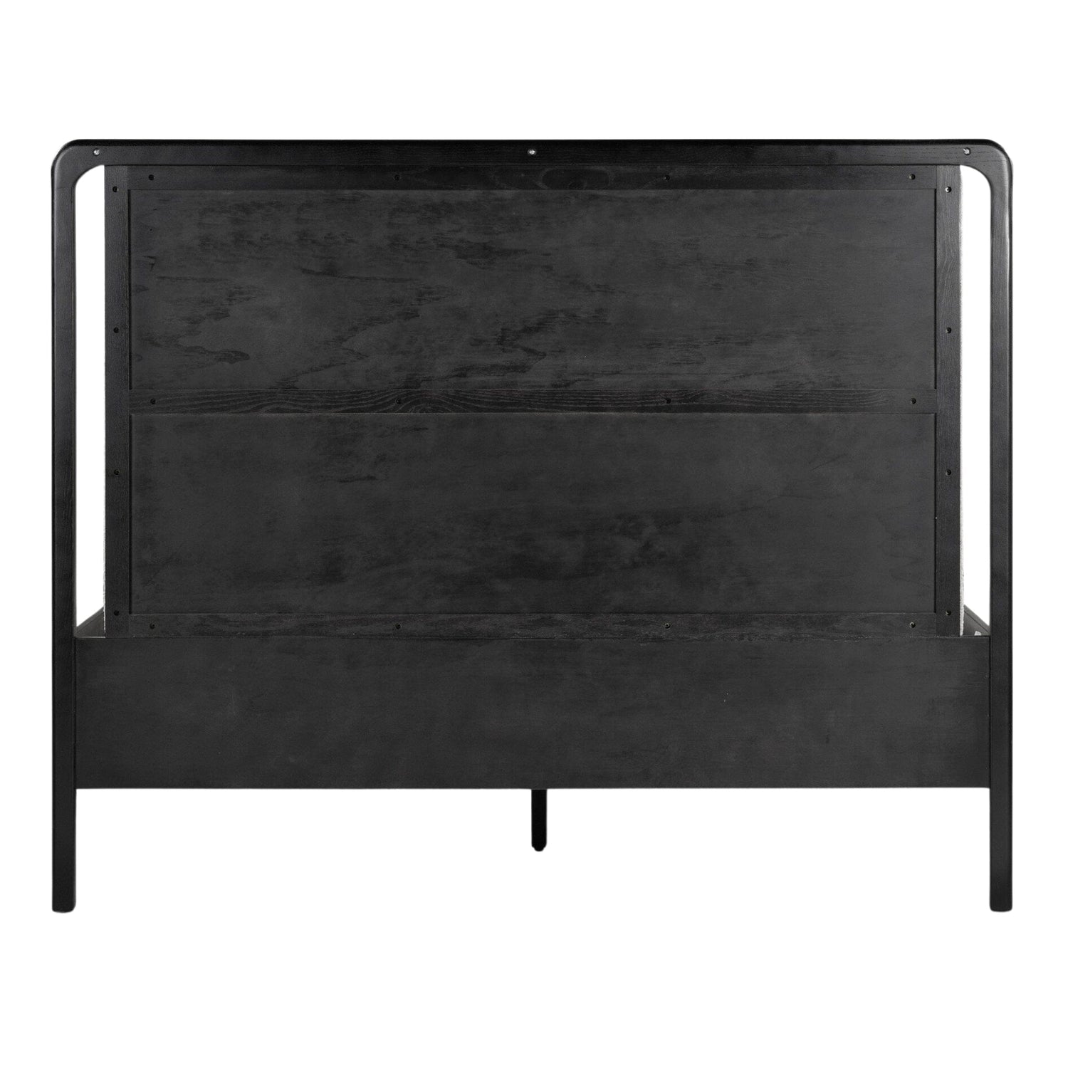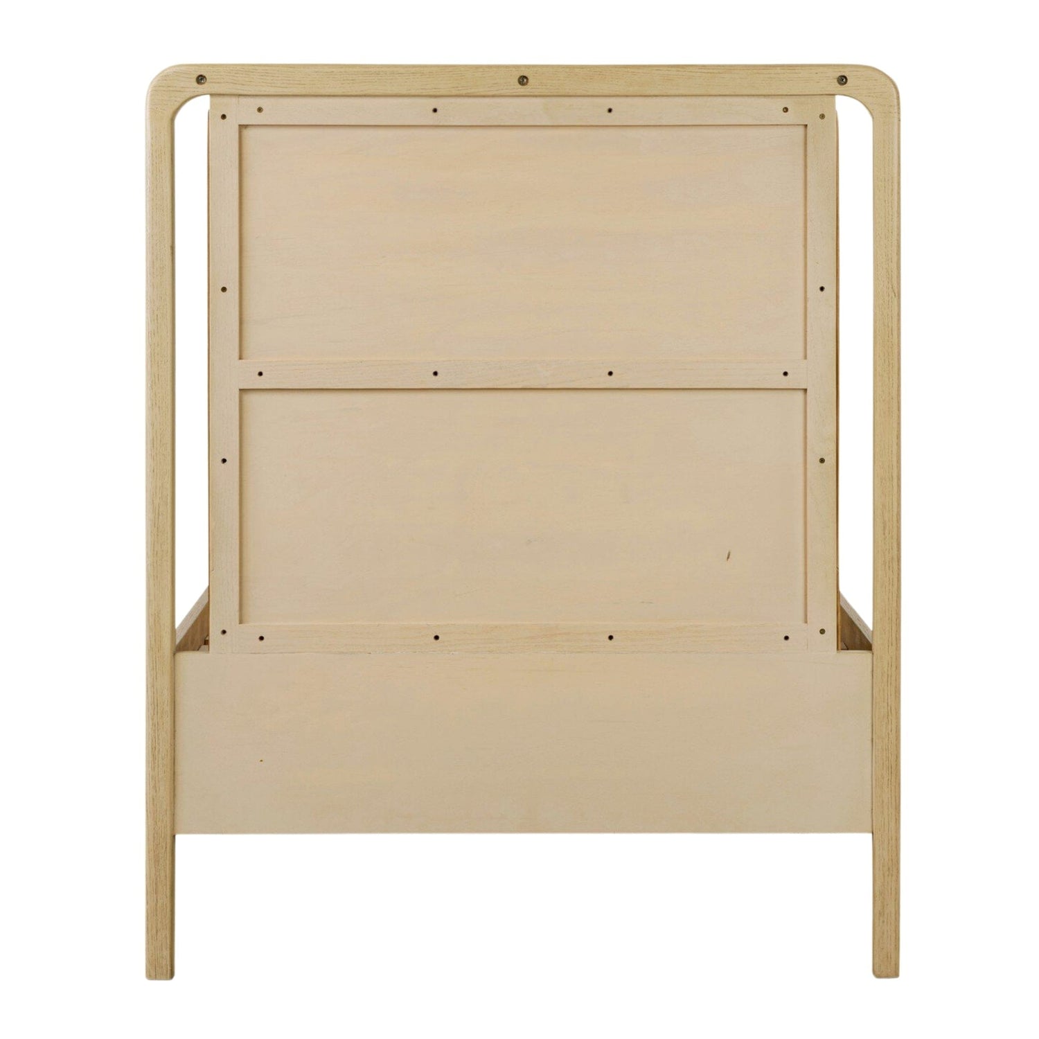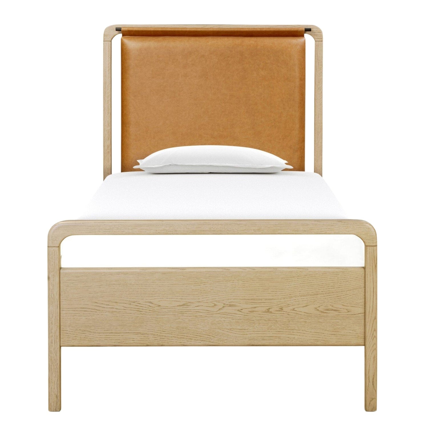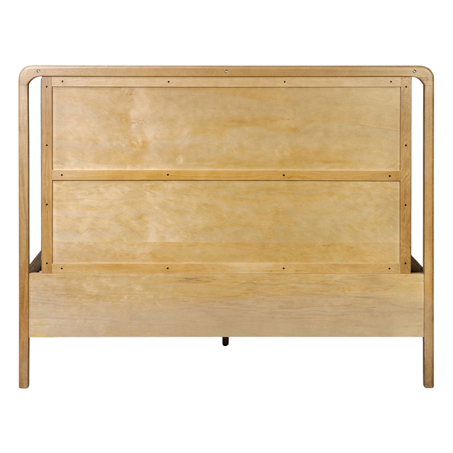A sculptural take on modern comfort. A sling-style headboard — offered in top-grain leather, high-performance fabric, or textured boucle — appears to float within a solid oak frame, available in a range of finishes. Subtly rounded edges and metal dowel detailing bring a soft, refined touch to the bedroom.