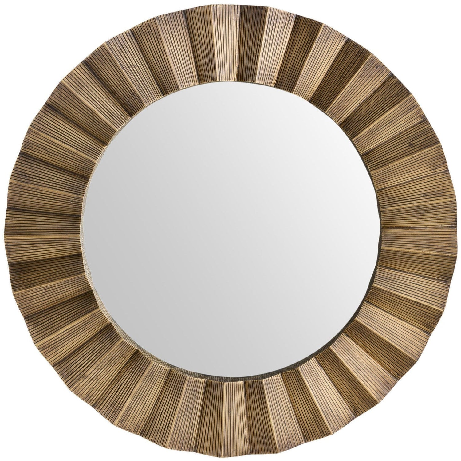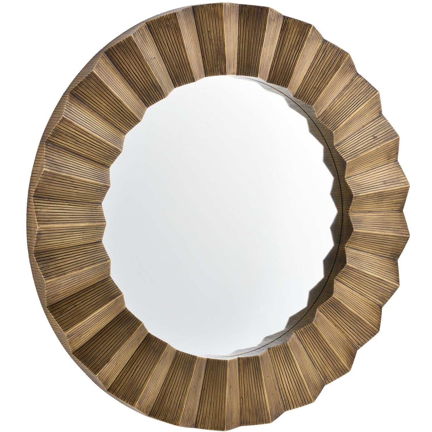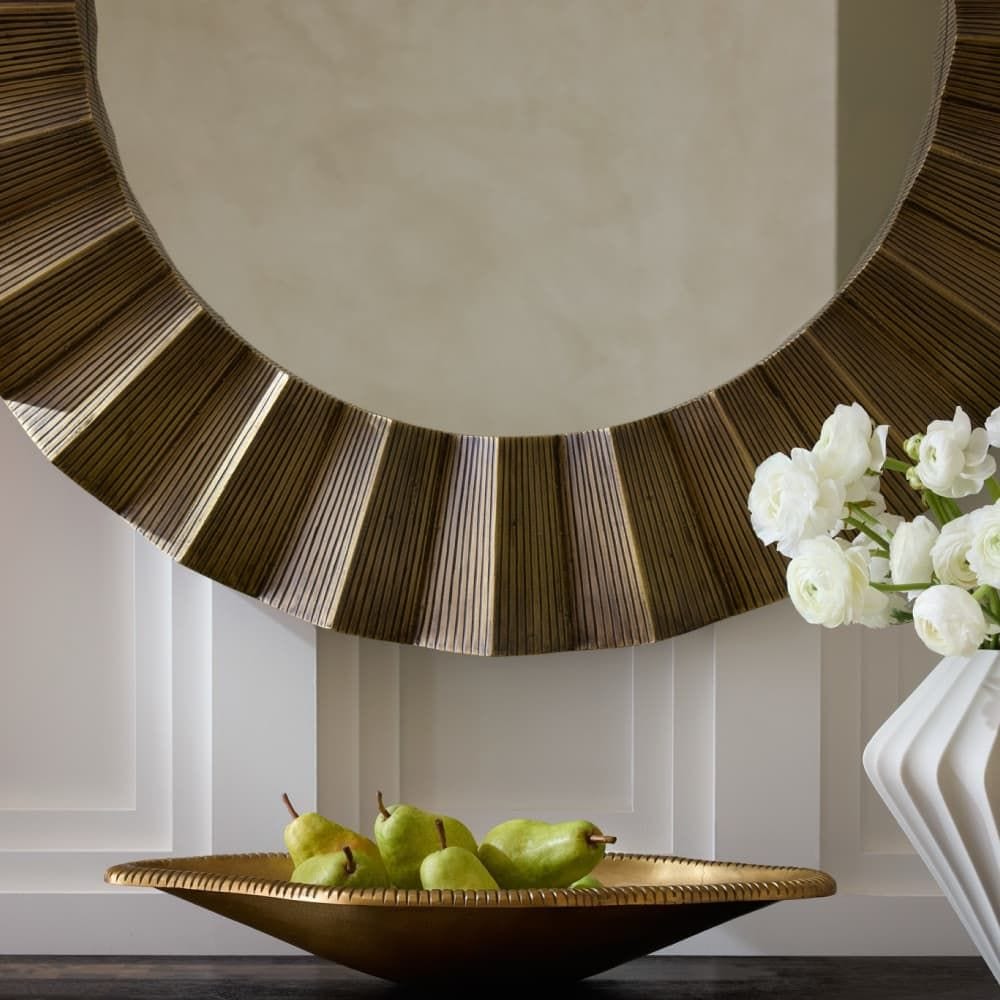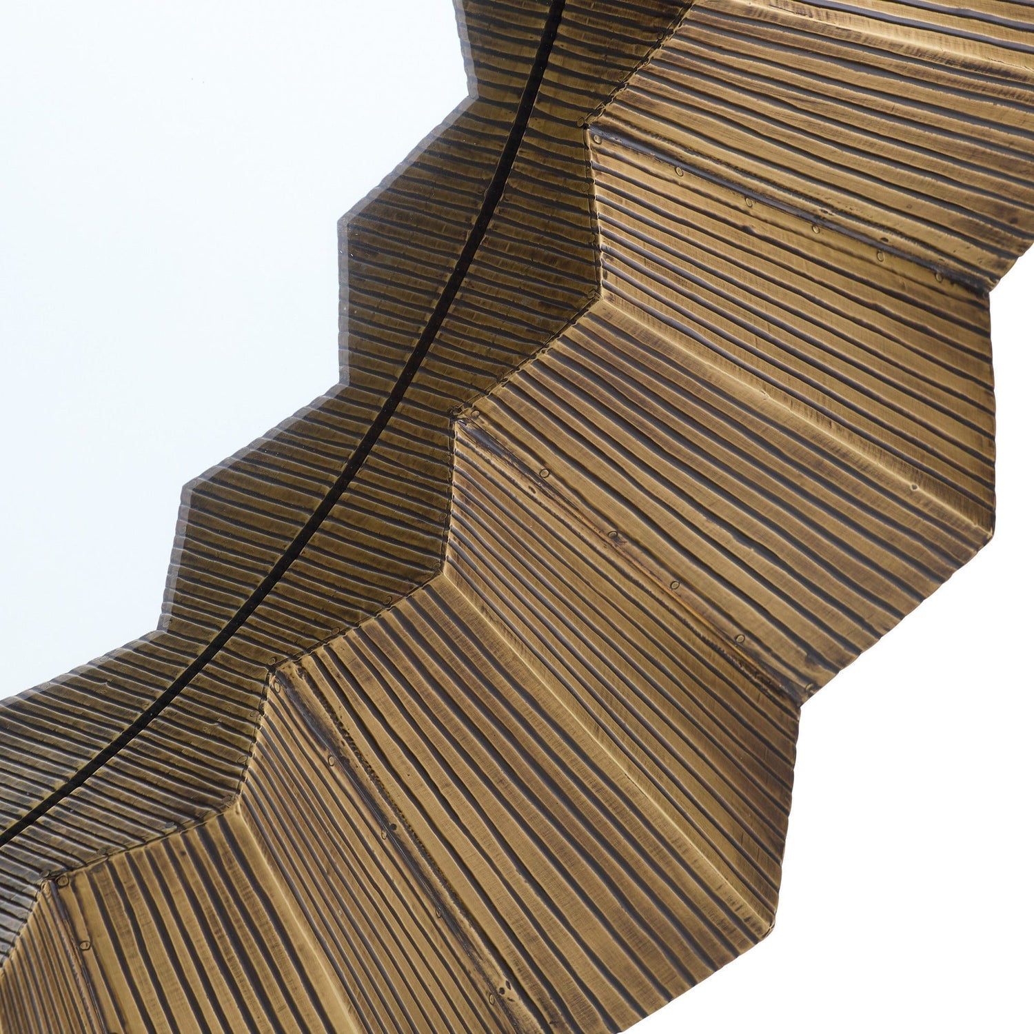 The textural frame delivers a starburst effect that is never less than statement-making. Brutalist-influenced, the dark antique brass-clad faceted frame perfectly juxtaposes the round mirror. Designed to be hung horizontally or vertically by a back cleat, it includes hanging hardware. Finish will vary.