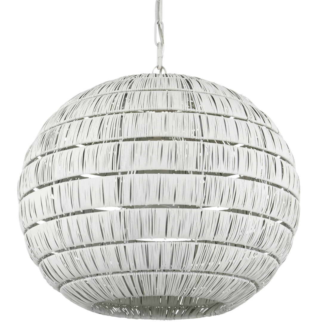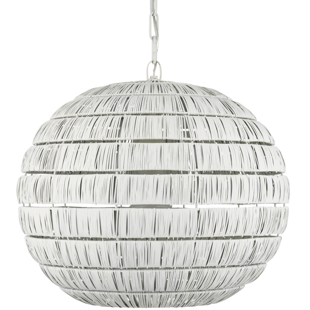 The Panopolis White Pendant is created using a painstaking process whereby artisans wrap individual thin strips of metal around rings that are spaced evenly to form a textural globe. The spaces between the wrapped tiers and the open bottom allow more light to filter through. This orb pendant will cast powerful patterns onto surrounding walls.