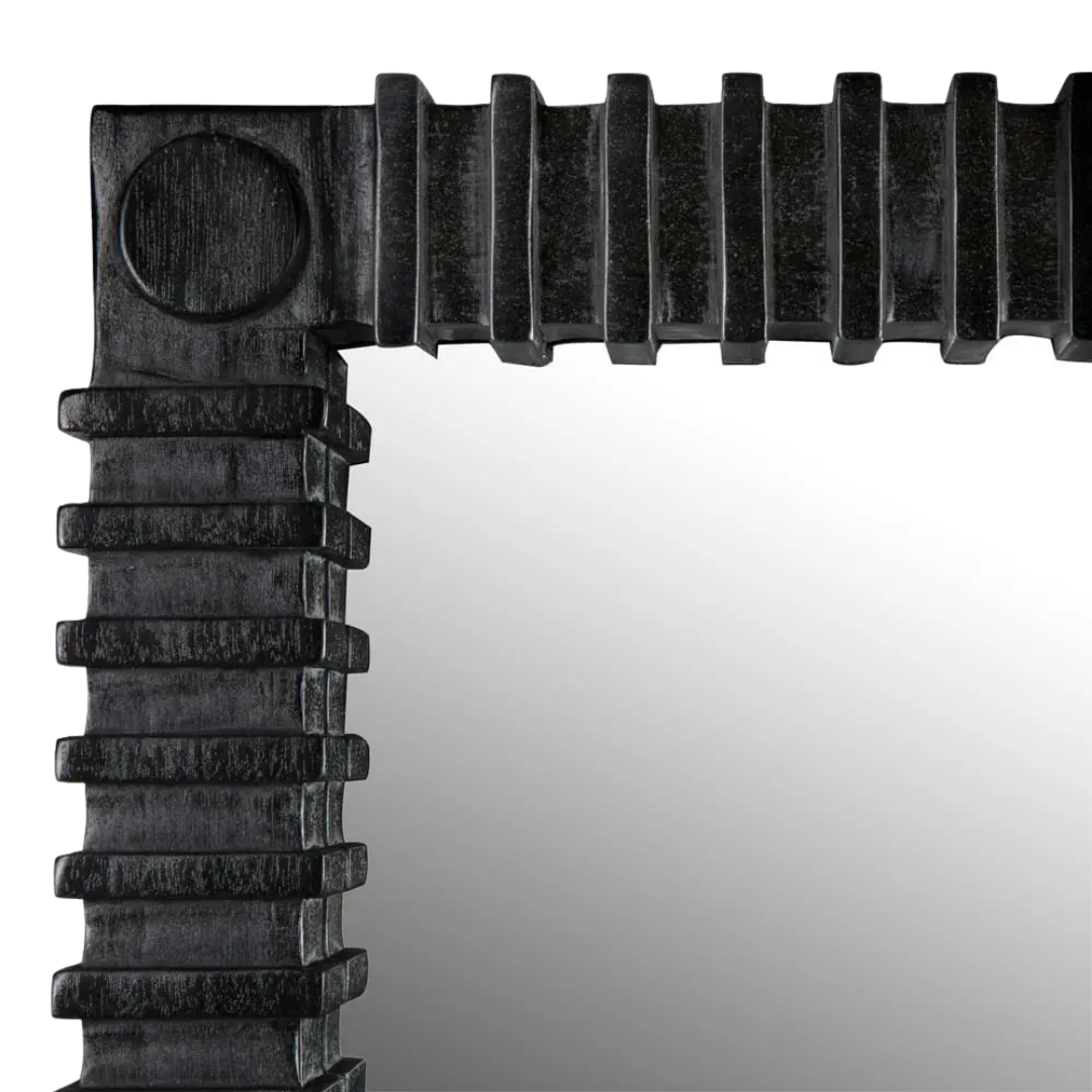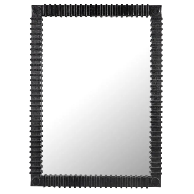 A moderate and versatile portrait size, the Rift Mirror pairs squared ribbing with simple, circular corner medallions for a reductive take on neoclassic style. Charcoal Black finish.
