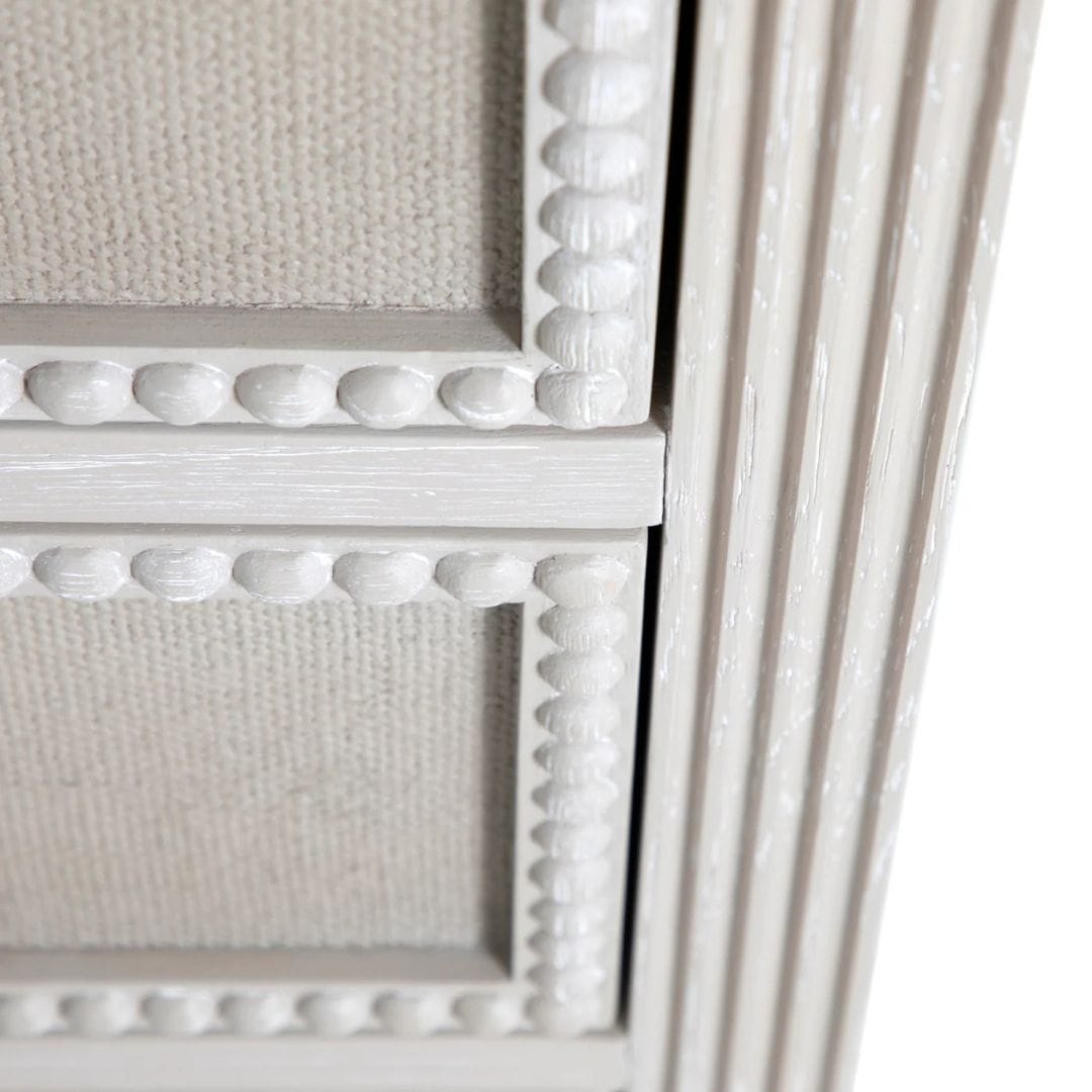 The Caroline Chest captures timeless elegance through its refined craftsmanship and classic design. Made from mahogany and mindi wood, it features drawer fronts overlaid with painted burlap that add subtle texture and visual depth. Available in antique white with feather gray or cerused white finishes, this piece brings a soft, sophisticated presence to any interior. Four spacious drawers offer ample storage while maintaining a graceful, balanced silhouette. Blending traditional detailing with a fresh, modern palette, the Caroline Chest complements both classic and contemporary spaces with ease.