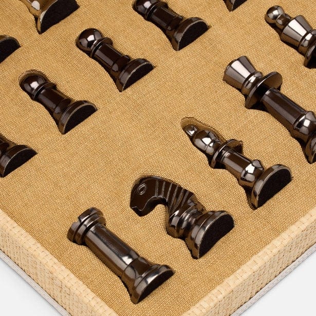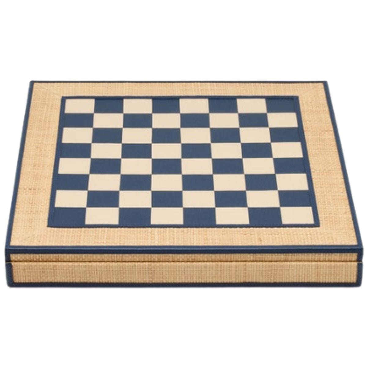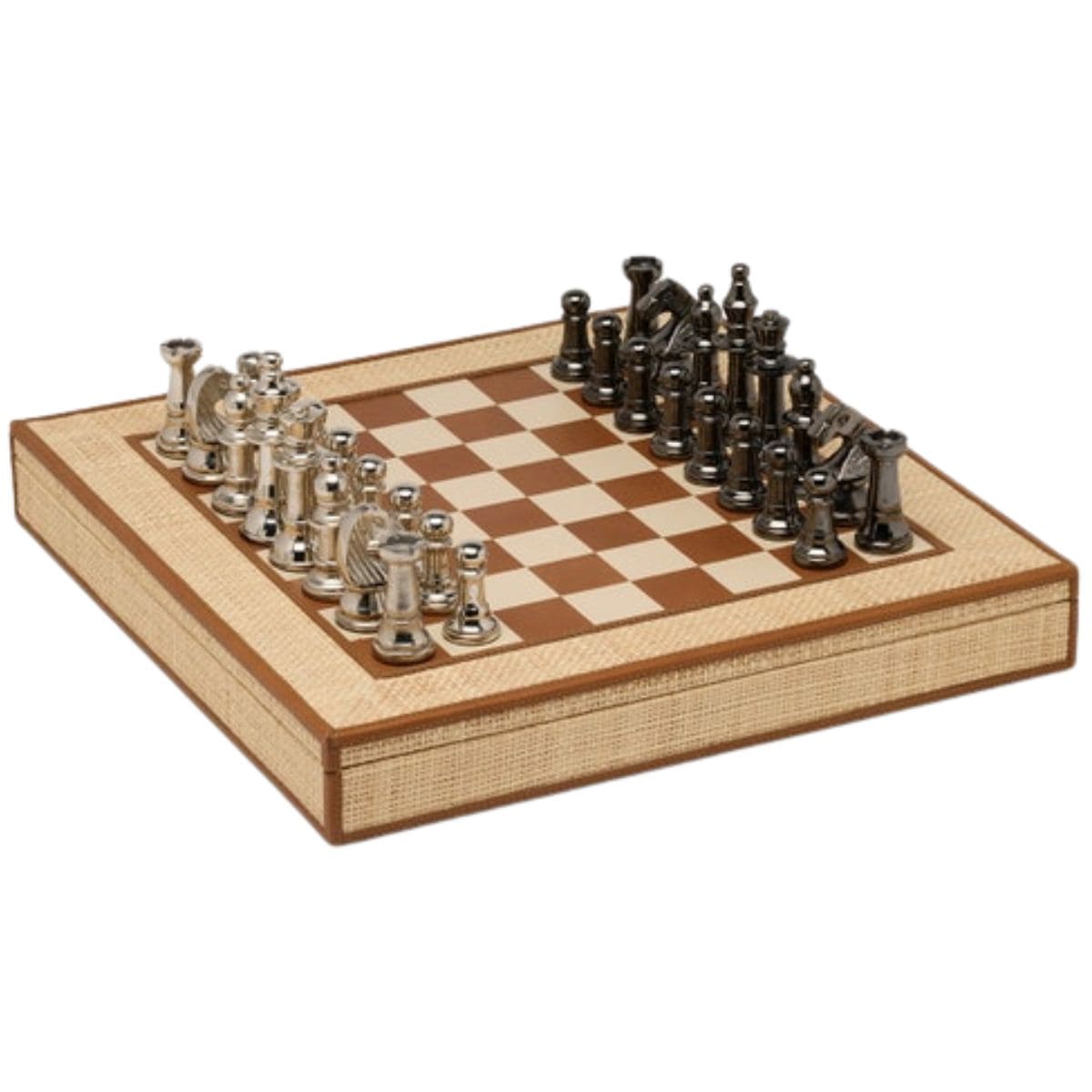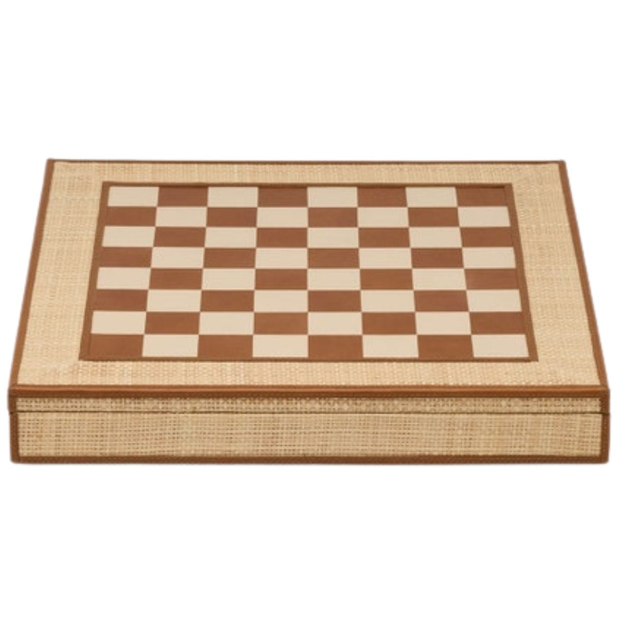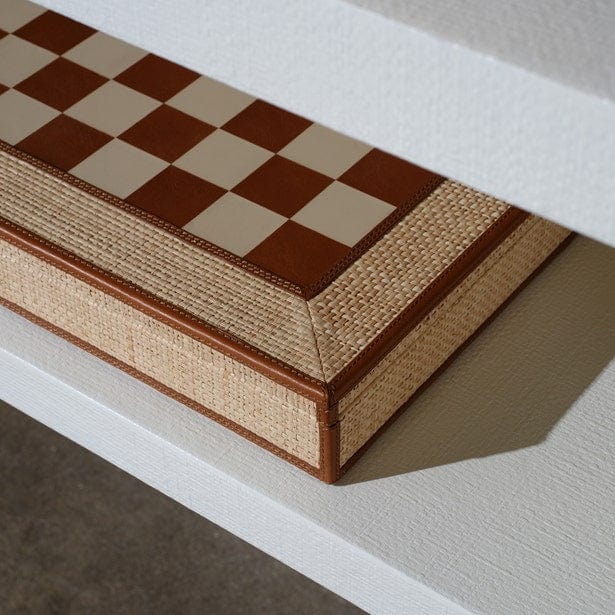 The Hanford chess set features exquisitely crafted accessories made from raffia, accented with stylish leather trim.