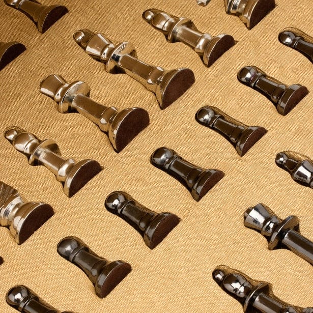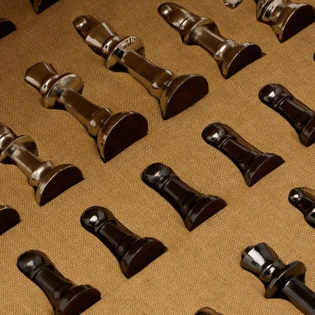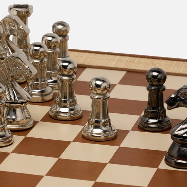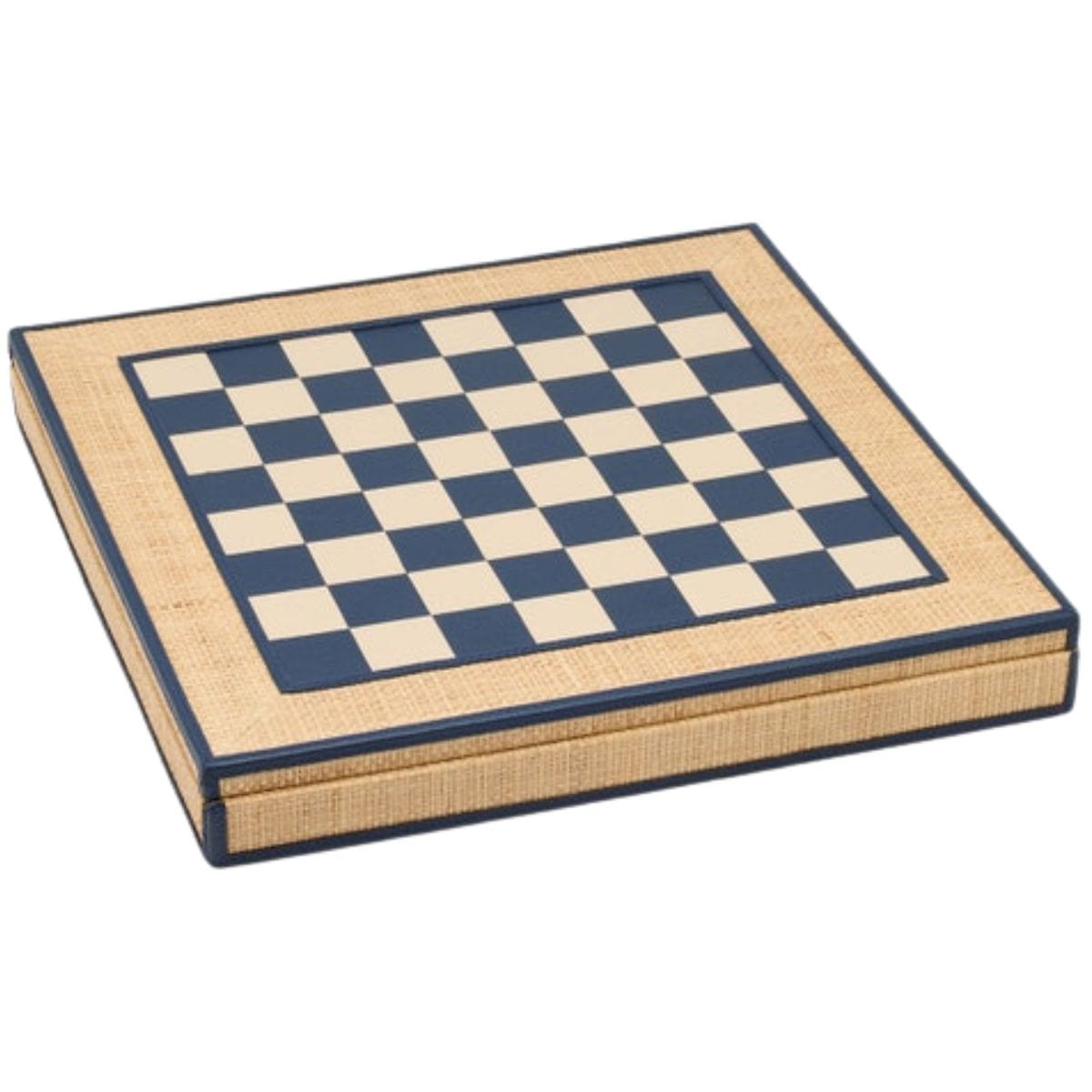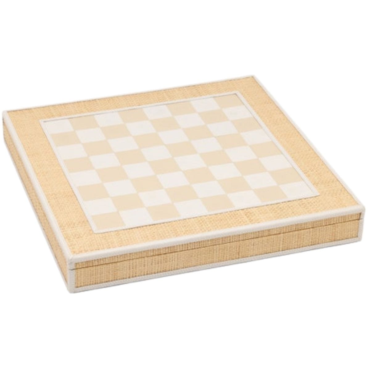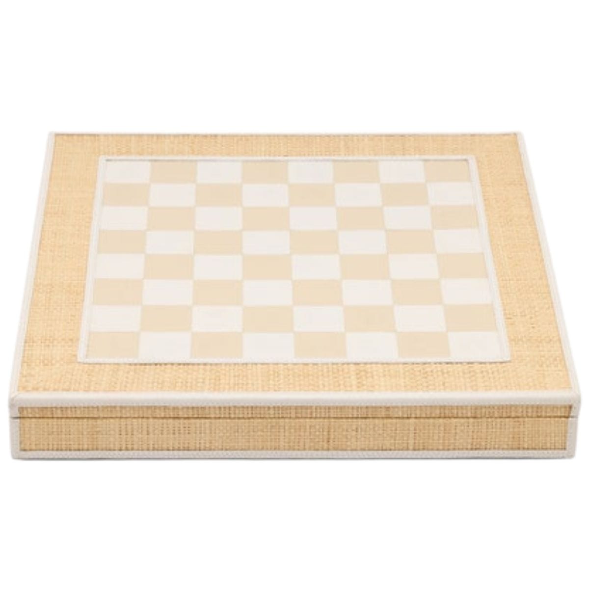 The Hanford chess set features exquisitely crafted accessories made from raffia, accented with stylish leather trim.