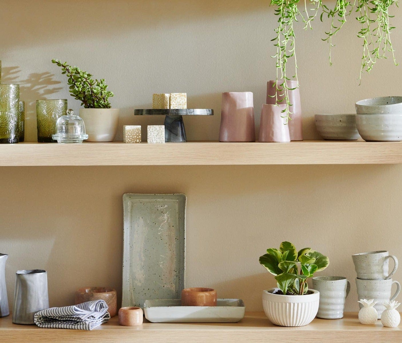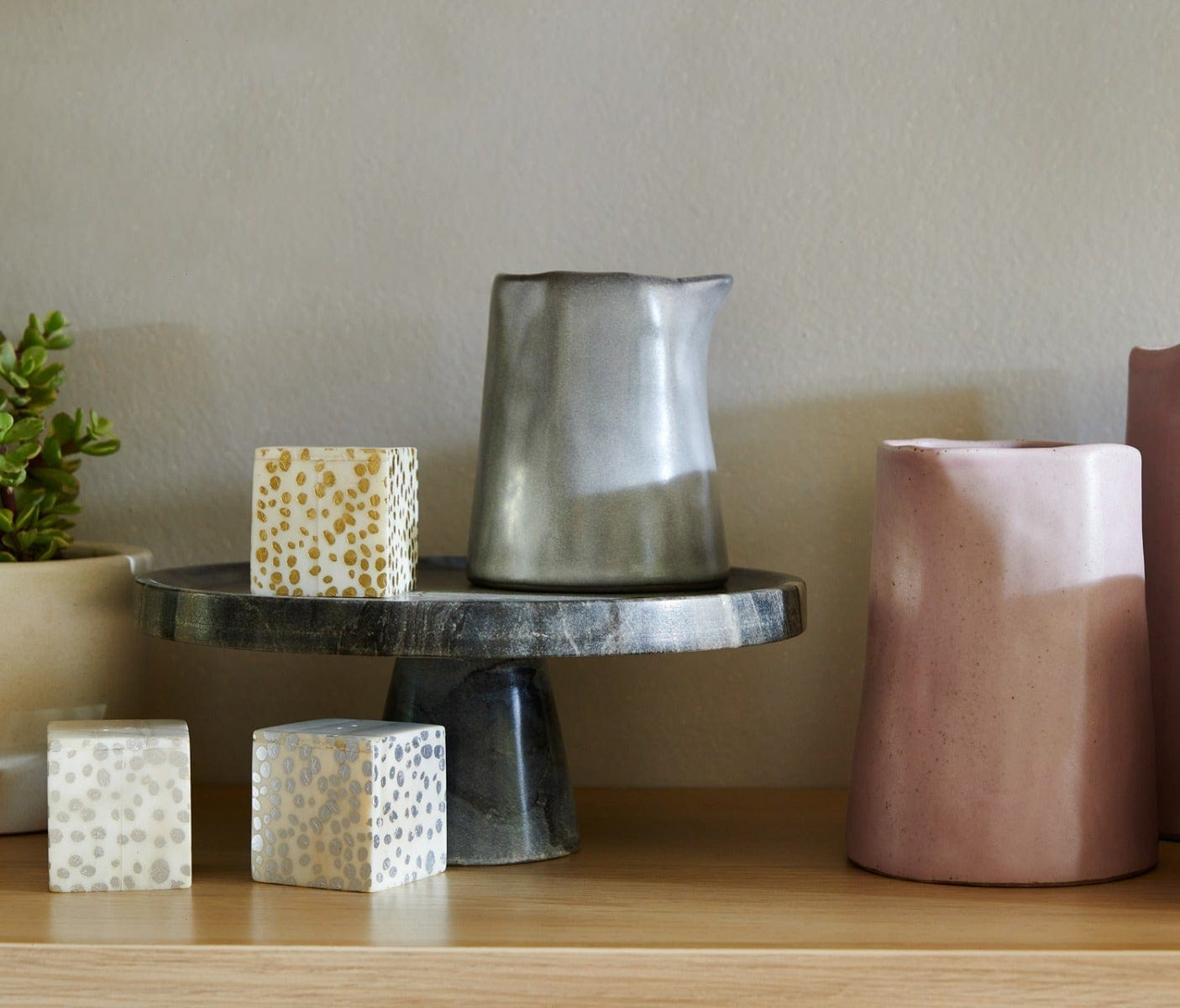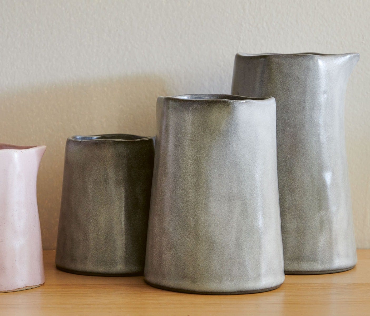 Fashioned in a mold, then decorated by hand, our Esther carafes delight any tabletop with their free-form aesthetic, geometric mouth and warm finish.