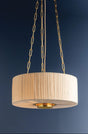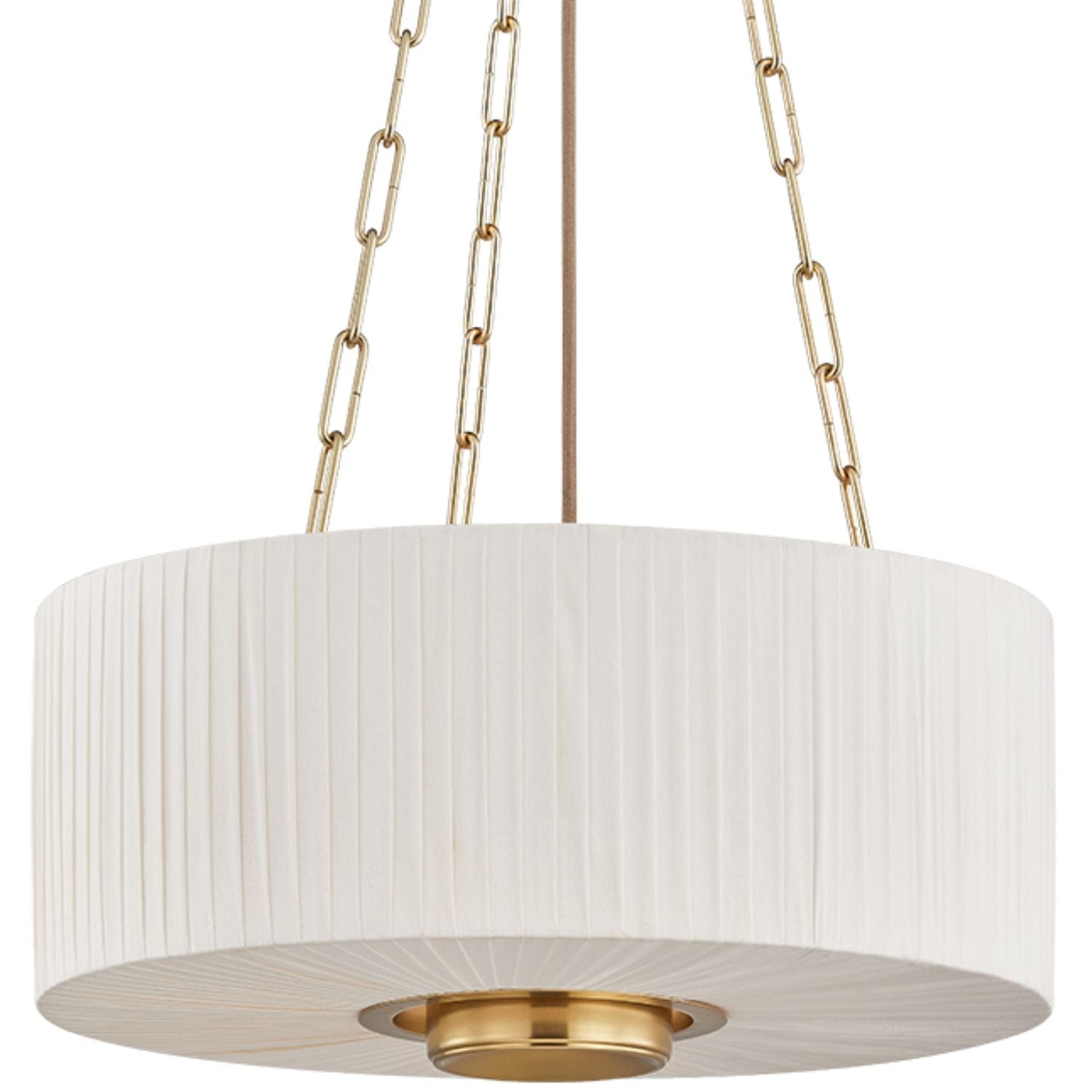 Camby balances oversized proportions with tailored details to create a sophisticated statement pendant. Supported by a triple-chain system, the pleated ivory linen shade channels a classic sense of style. An Aged Brass oculus anchors the piece, adding a focal point from below. Available in 3 and 4-light options, Camby pairs beautifully with many design schemes.