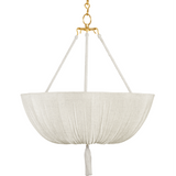 The Carolina pendant explores proportion and materiality with quiet confidence. The generous, soft form of the raw silk is eye-catching and special as it overlays a clear etched glass shade. The wrapped rods and matching tassel further add to the striking, airy material story. Accented by Aged Brass hardware, Carolina’s warm, luxurious presence makes for a dreamy piece in dining areas and bedrooms.