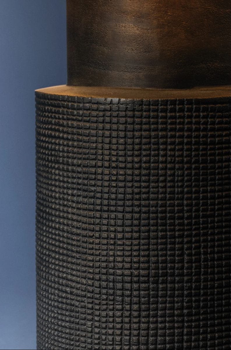 Handcrafted in India, the Farmingdale table lamp taps into the trend for artisanal pieces. The cast aluminum base features a stacked, cylindrical shape with a highly textural grid pattern and exposed edge detailing. A smooth neck provides a break in texture, while the natural linen shade softens the overall look. Dark Bronze hardware coordinates with the metalwork of this striking lamp.