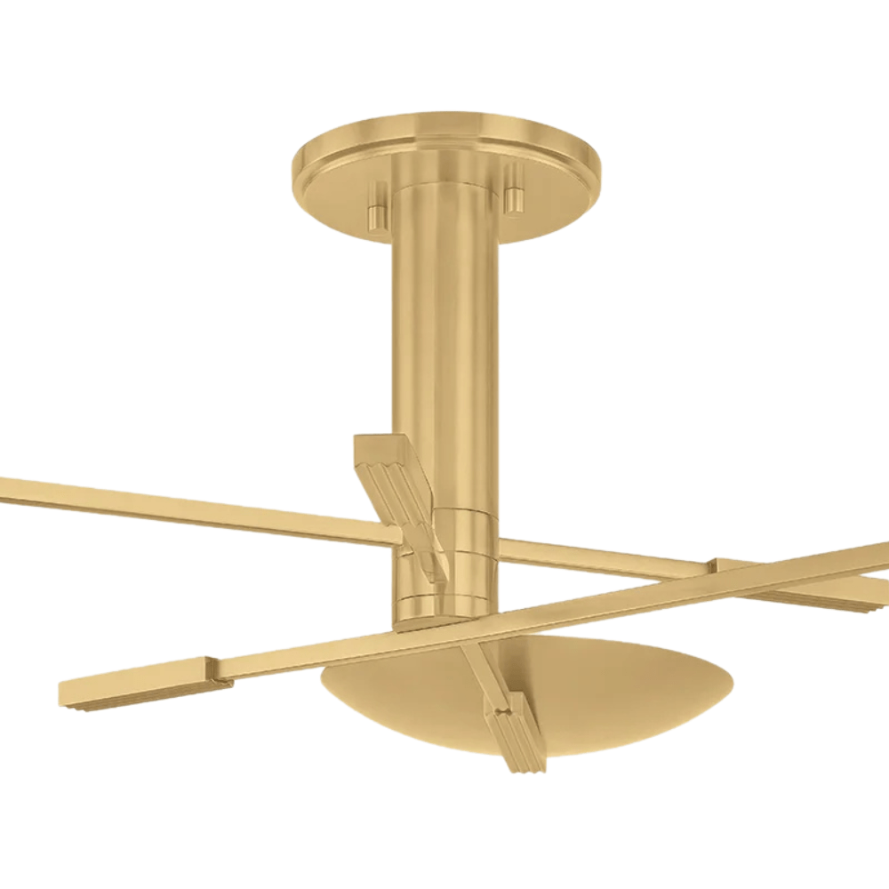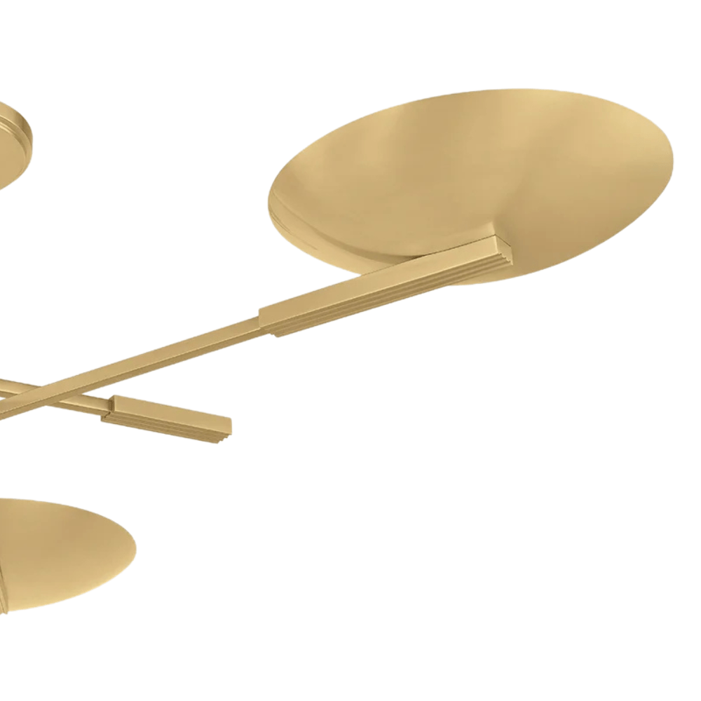 The Johnson family gives a modernist silhouette an industrial twist. Reminiscent of spokes, the slender arms of this chandelier and flush mount support shallow dome shades that direct LED light upwards. Each arm features a subtle linear knurl at the ends, while the center stem is grooved at the bottom for added texture. Finished in Aged Brass.