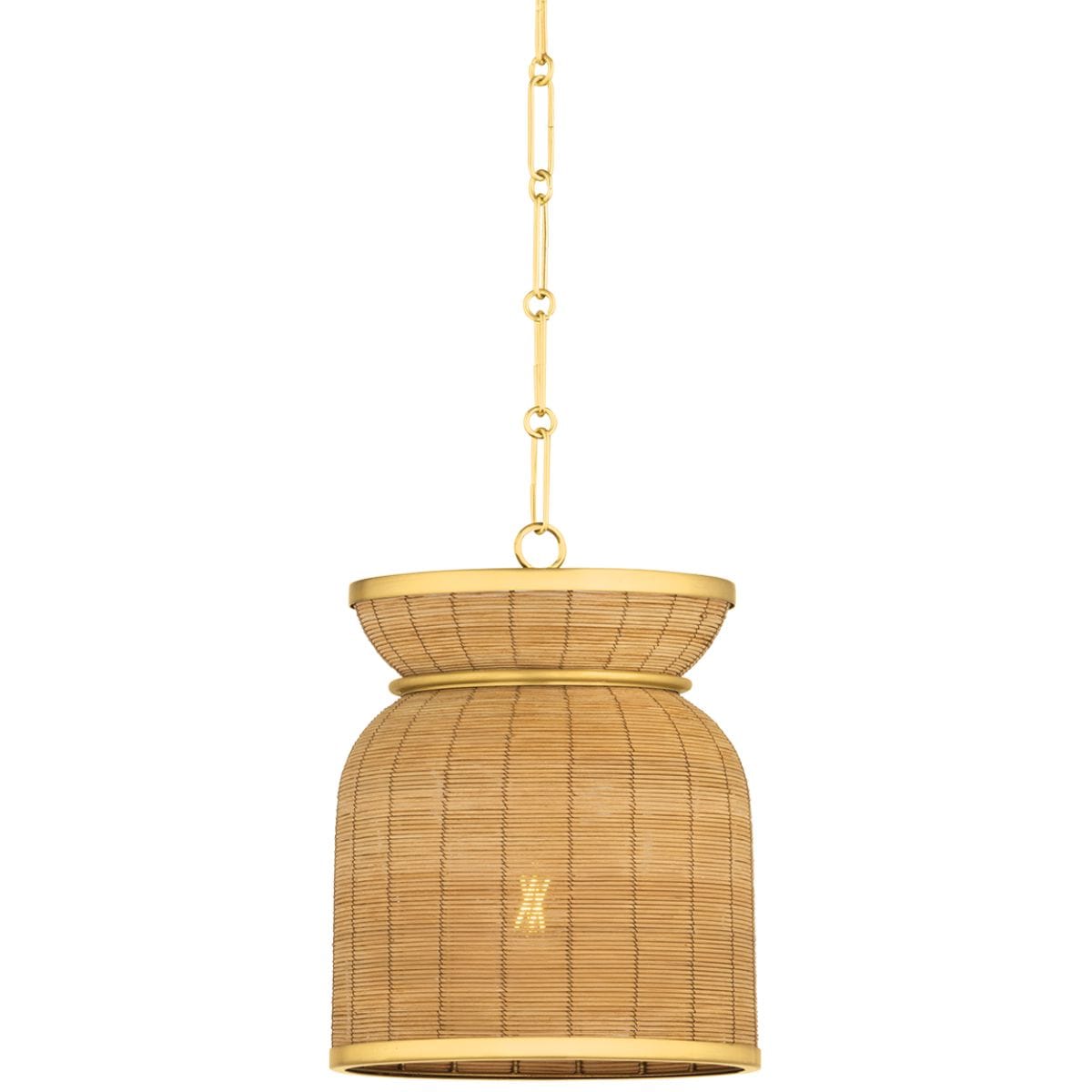 Handcrafted in India, the basket-inspired weave of the Parkchester pendant highlights the special qualities of natural rattan. Adding a note of shine to the construction, an Aged Brass band cinches the fixture at the top, coordinating with the chunky chain suspension. Available in two sizes, Parkchester filters the light to beautiful effect.