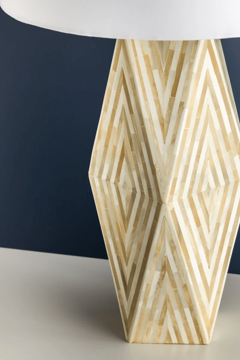 Intricately patterned in bone inlay, the faceted design of Syracuse adds character to a side table, desk, or console. Softening the angularity of the triangular cuts on the base, the inlay is divided into small segments with alternating warm neutral hues. Aged Brass accents at the neck and a large white linen drum shade offer refined finishing notes.