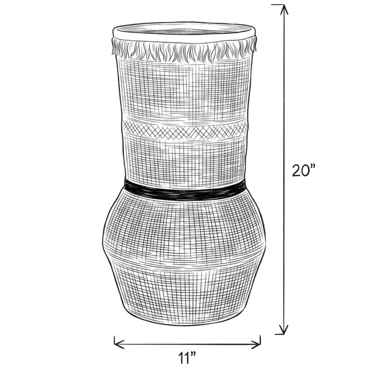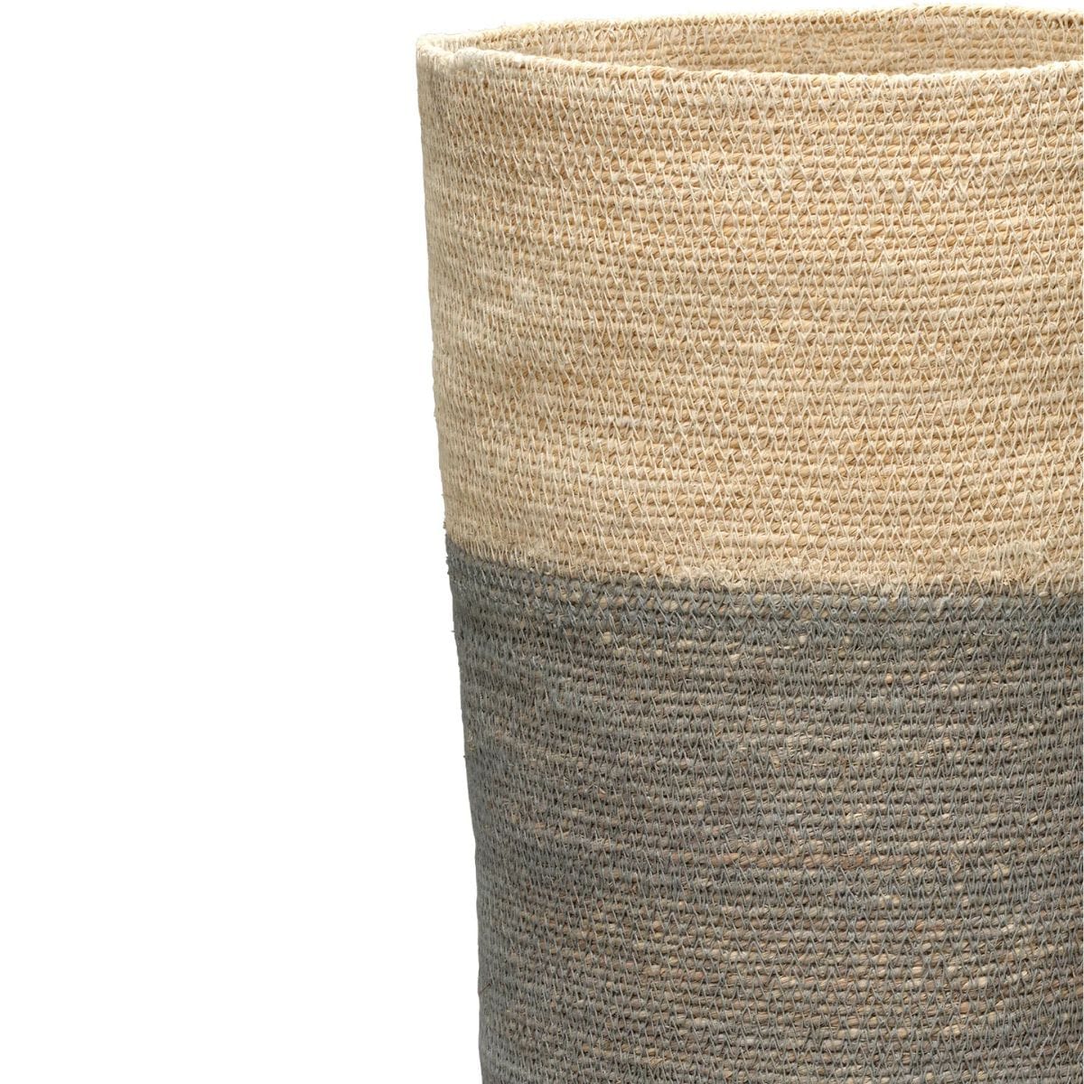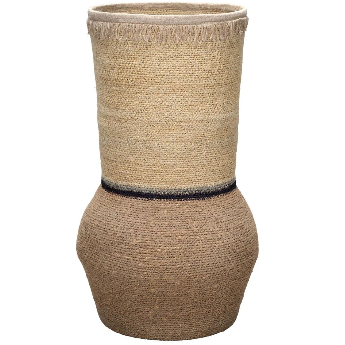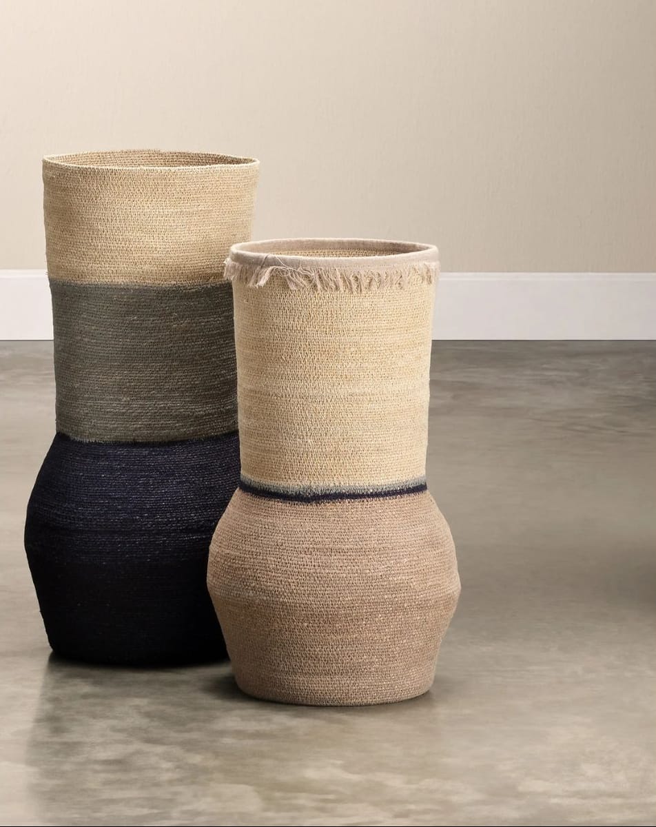 Each is crafted of natural seagrass. Its curvaceous hourglass shape is embellished at the top with a hand-feathered fringe and in the middle with two bands, one in deep black and one in soft gray, that accentuate its shapely lines. The baskets will vary slightly in color and shape, as the natural fiber has a beautiful variation. We love them filled with similarly organic-inspired elements, such as a potted palm, tall reeds, or feathers. You can also pair them with pottery in similar tones for an earthy, organic grouping.