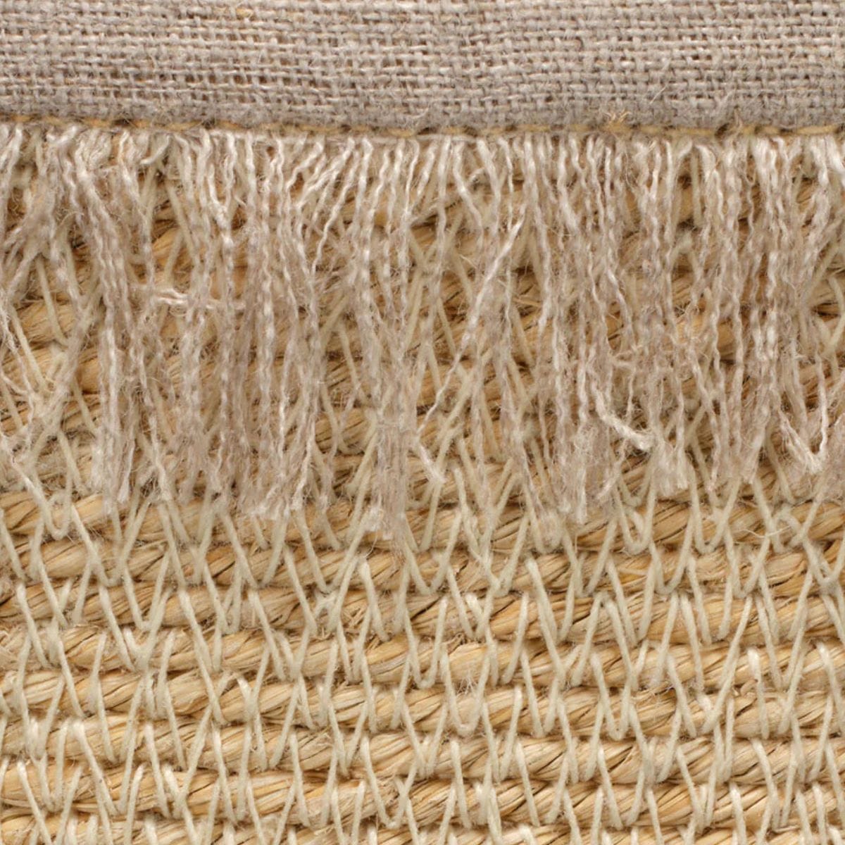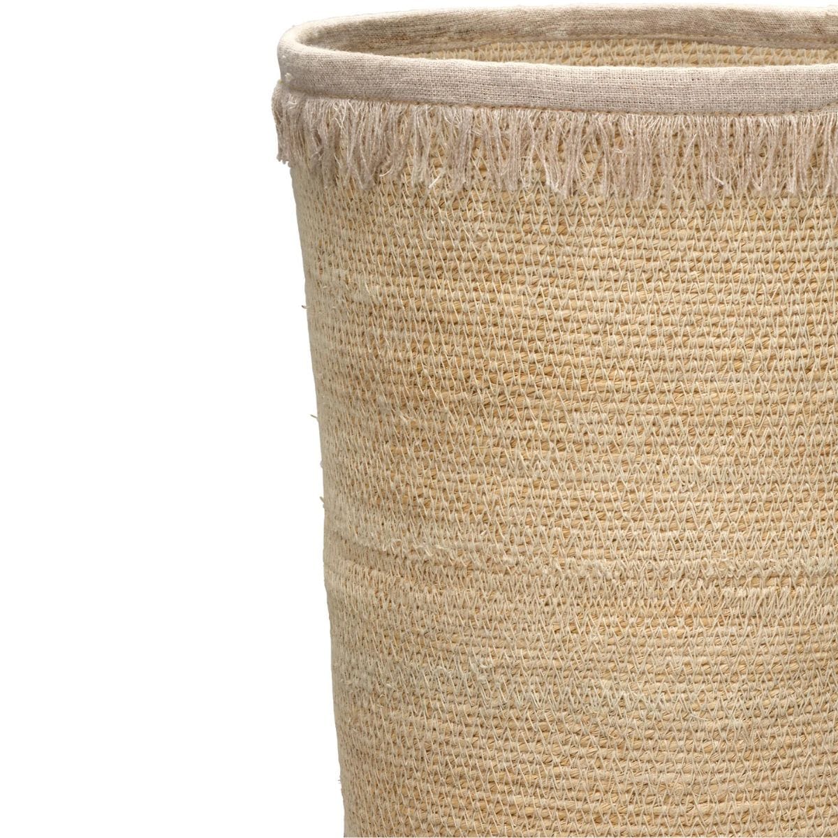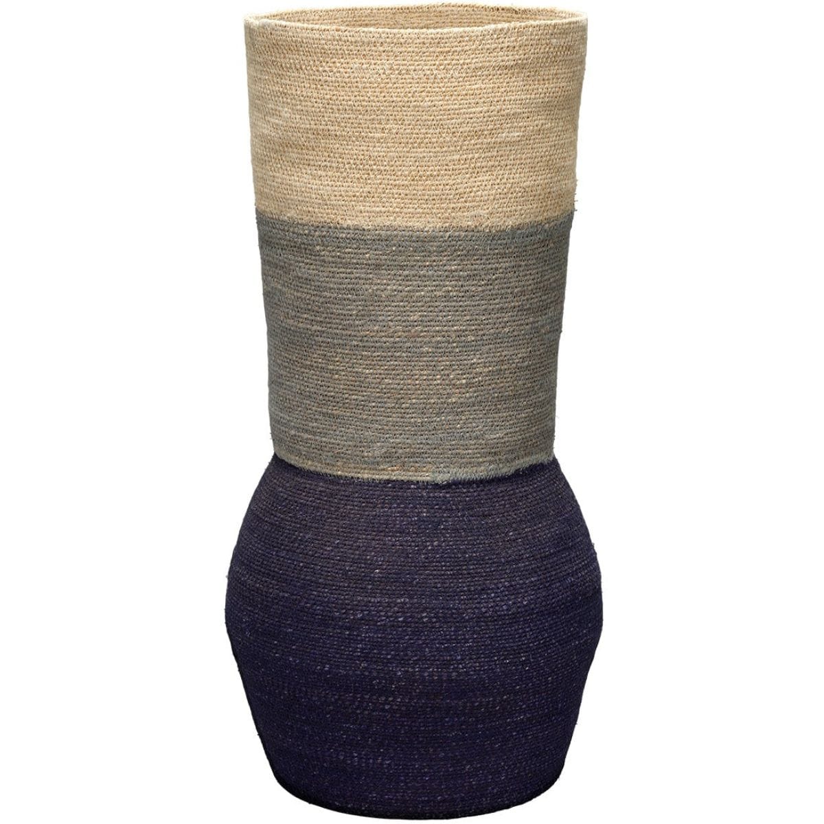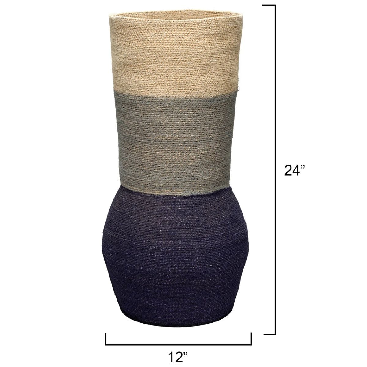 Each is crafted of natural seagrass. Its curvaceous hourglass shape is embellished at the top with a hand-feathered fringe and in the middle with two bands, one in deep black and one in soft gray, that accentuate its shapely lines. The baskets will vary slightly in color and shape, as the natural fiber has a beautiful variation. We love them filled with similarly organic-inspired elements, such as a potted palm, tall reeds, or feathers. You can also pair them with pottery in similar tones for an earthy, organic grouping.