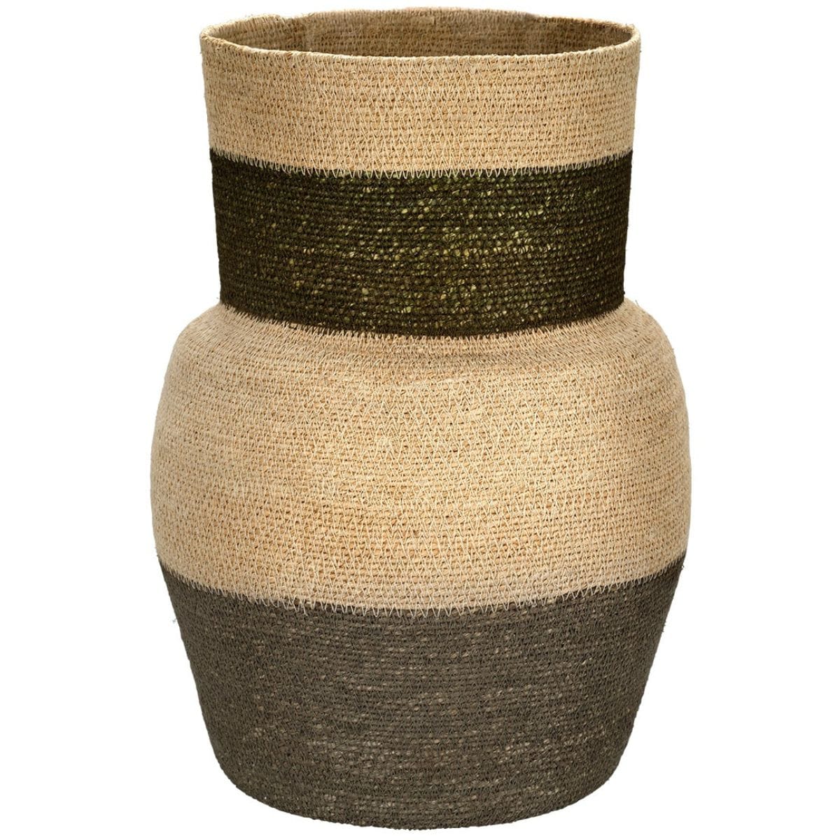 Each is artisan-crafted of natural seagrass. Its curvaceous hourglass shape and soft beige and sage palette are soothing to the eye and easy to integrate into any decor. The baskets vary slightly in color and shape, as the natural fiber has a beautiful variation. We love them filled with similarly organic-inspired elements, such as a potted palm, tall reeds, or feathers. You can also pair them with pottery in similar tones for an earthy, organic grouping.