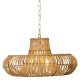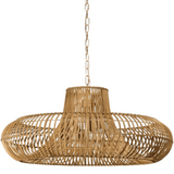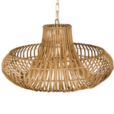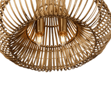 Our Yaresly pendant light is constructed from a striking mix of rattan peel and smooth metal, allowing chic Edison bulbs to shine through a natural material cage. The rattan peel structure curves upward and slightly back into a rounded ring, tapering up to meet the chain rope and circular base.