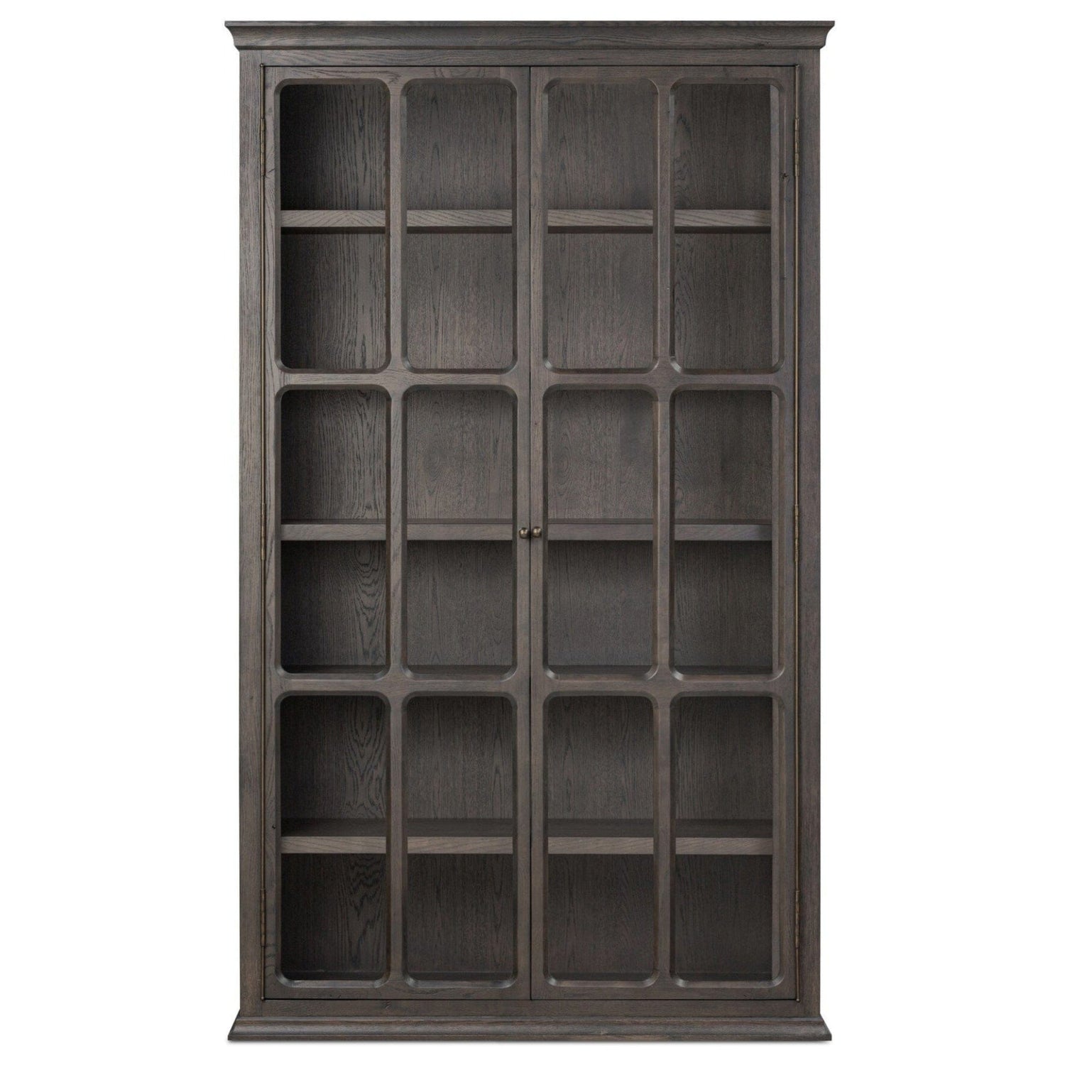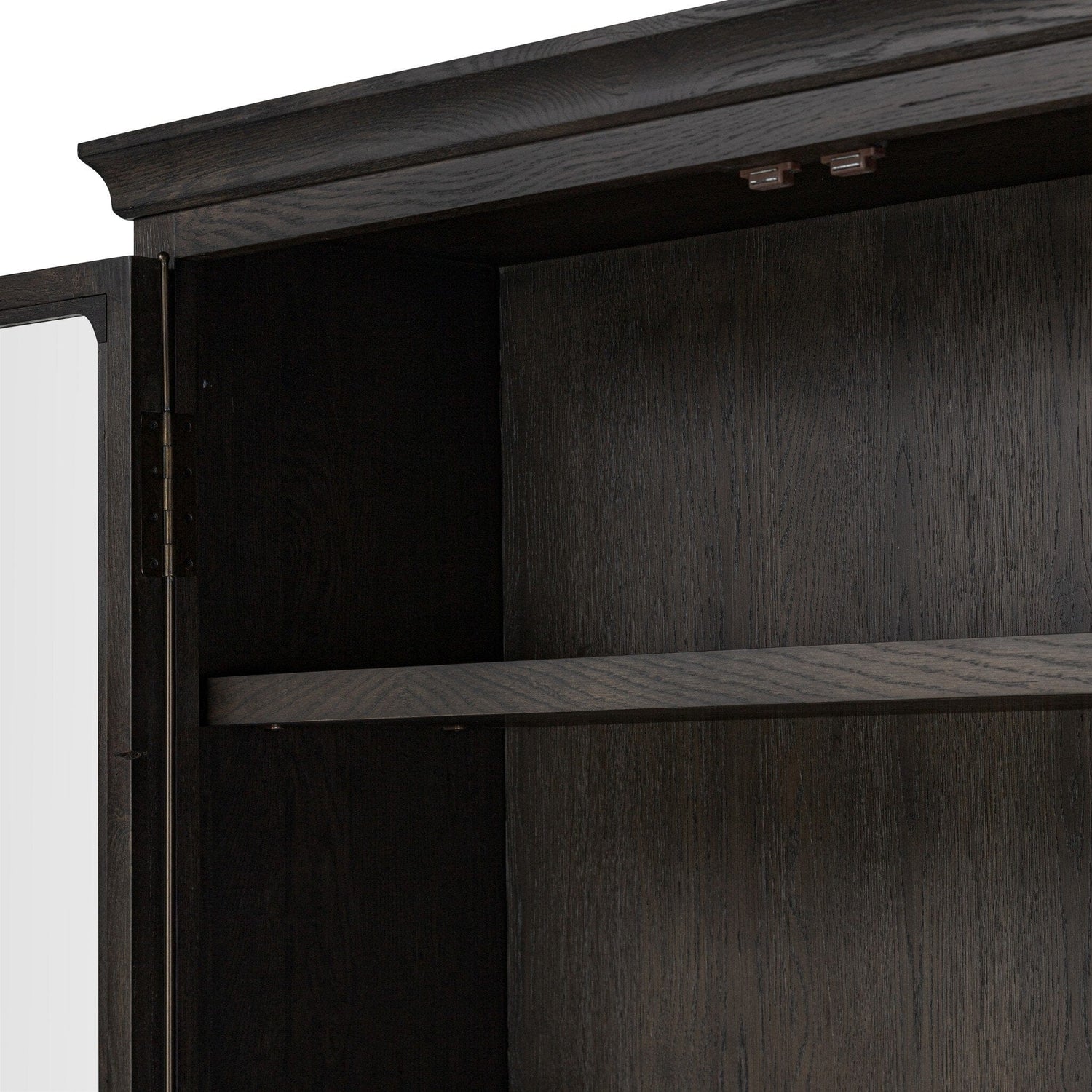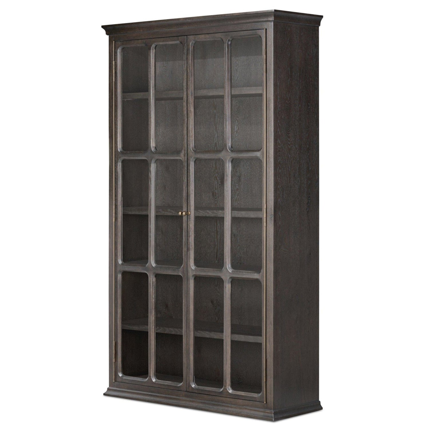 Work the timeless charm of a vintage find into your collection. Oak cabinetry—available in weathered or smoked black finishes—features softened mullions and rounded glass panels, with aged bronze barrel hinges and finial detailing. Generous storage and display options empower you to create a space that tells your story.